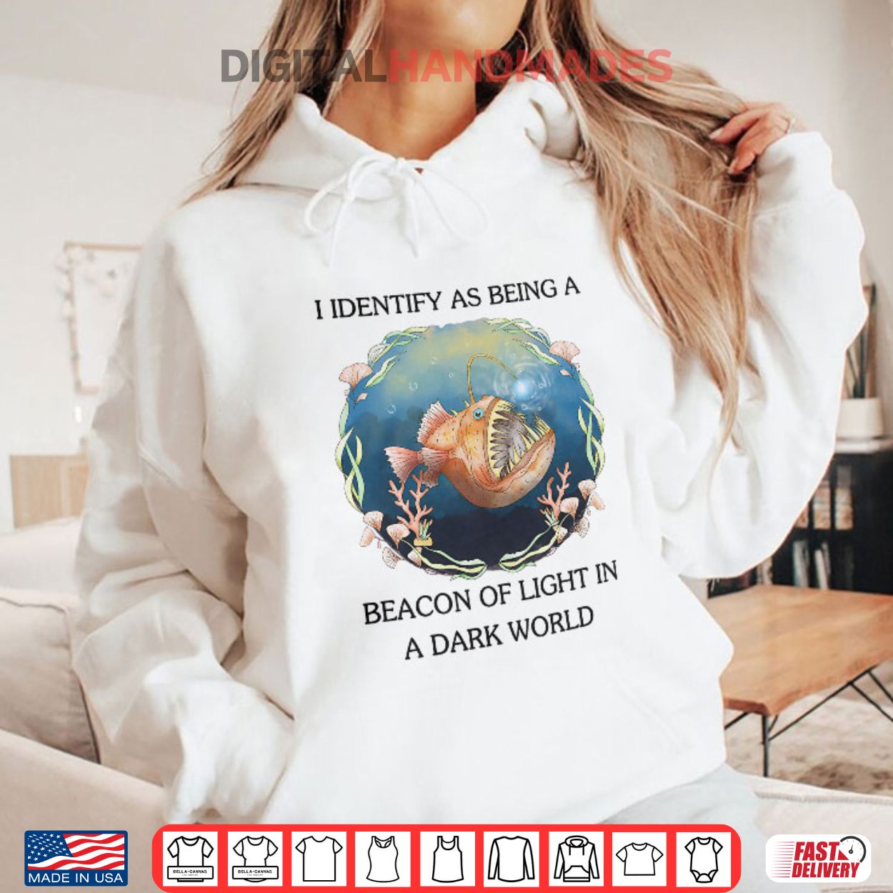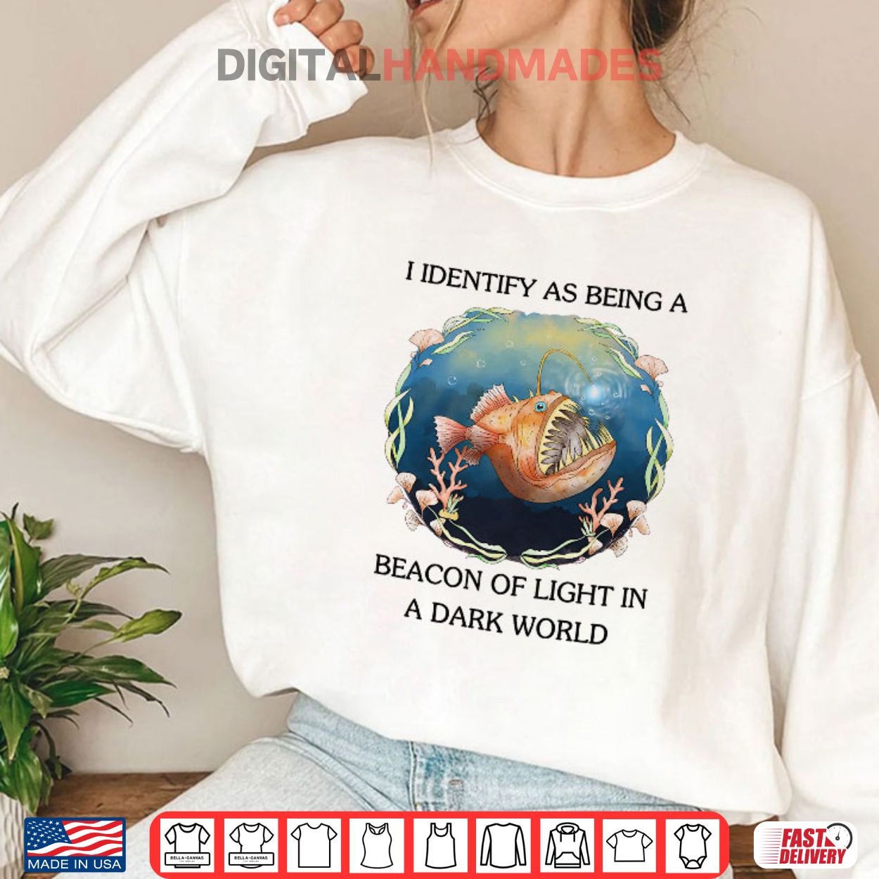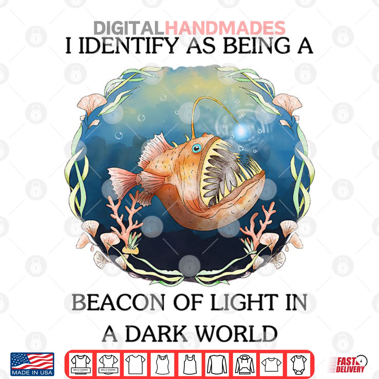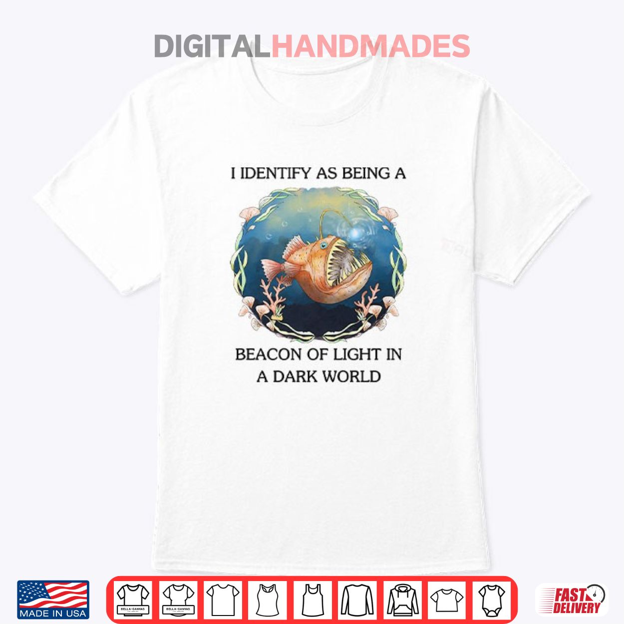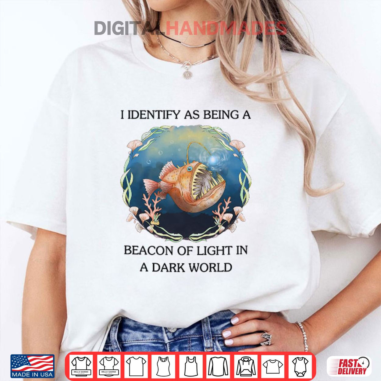 This t-shirt features a striking image of an anglerfish paired with the phrase ‘I Identify As Being A Beacon Of Light In A Dark World.’ The phrase ‘I identify as’ is a common expression used in discussions about personal identity and self-perception.