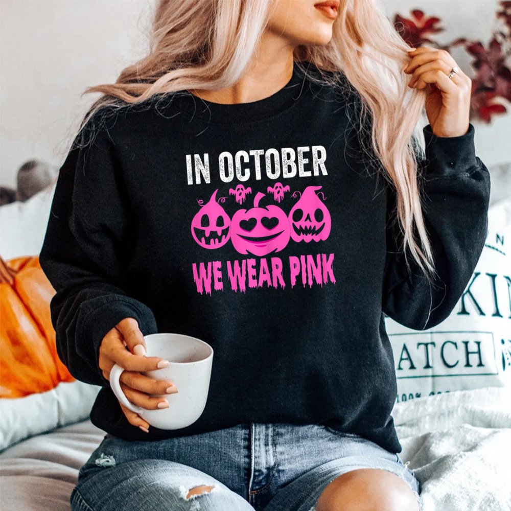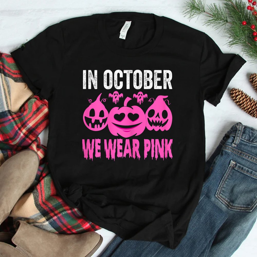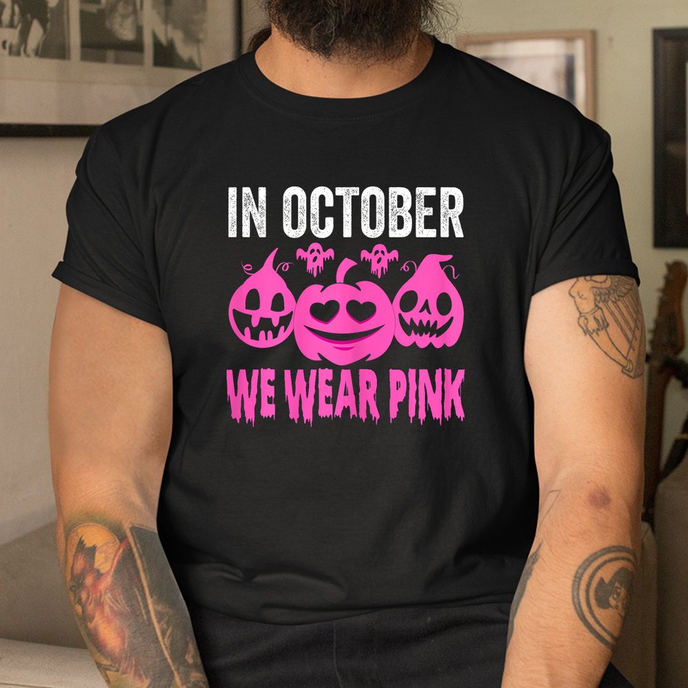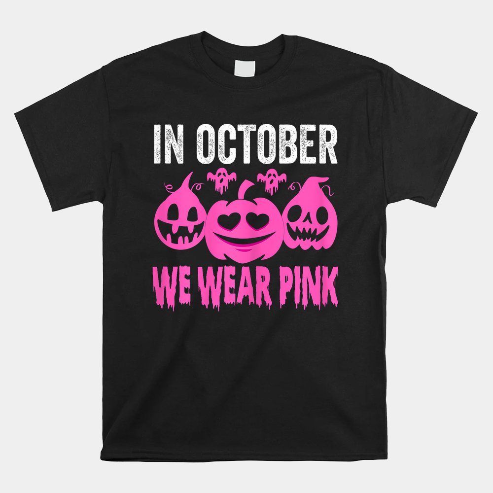 In October We Wear Pink Breast Cancer Pumpkin Halloween Shirt, hoodie, sweatshirt, long sleeve and ladies T-shirt