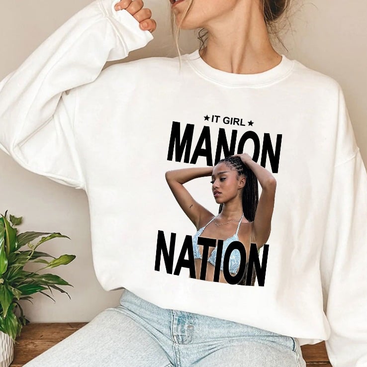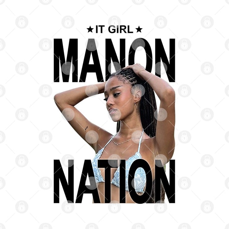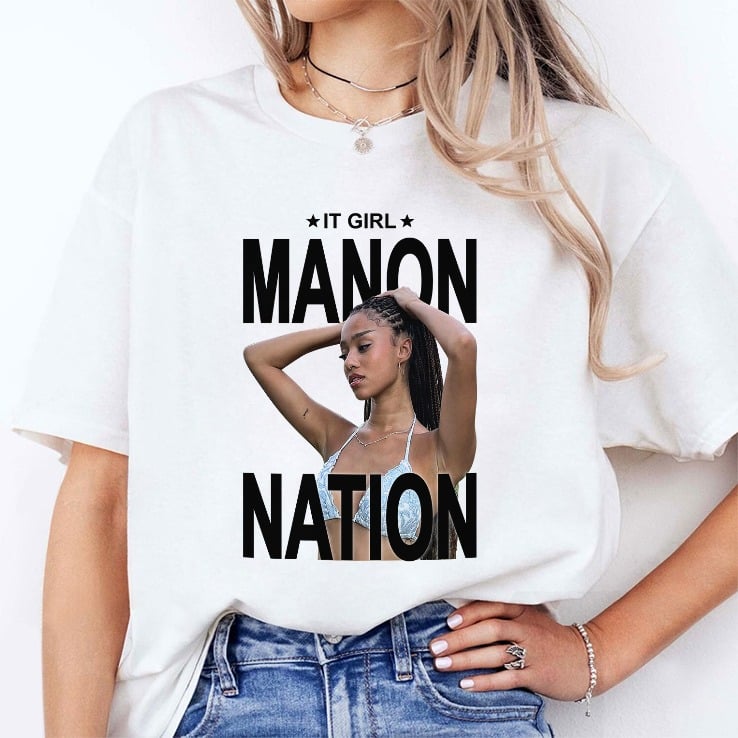 The t-shirt stands out with the image of Manon Bannerman and the phrase “It Girl Manon Nation”. Meret Manon Bannerman is a Ghanaian/Swiss-Italian singer and model signed to Geffen Records and HYBE Labels. She is best known as the eldest member of the global girl group KATSEYE.