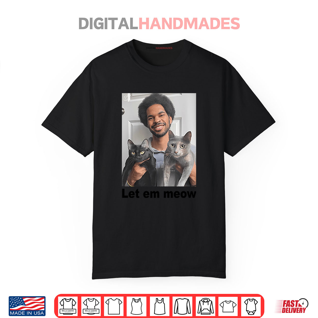 jarrett allen cats let em meow, funny basketball graphic tee, spring sports apparel, bold cat humor design, playful casual spring fashion, lighthearted meow tee, springtime quirky style, humorous jarrett shirt, funny fan apparel, cute spring wear
