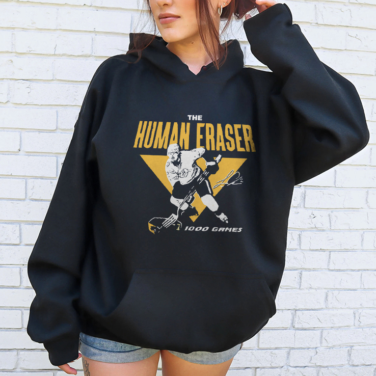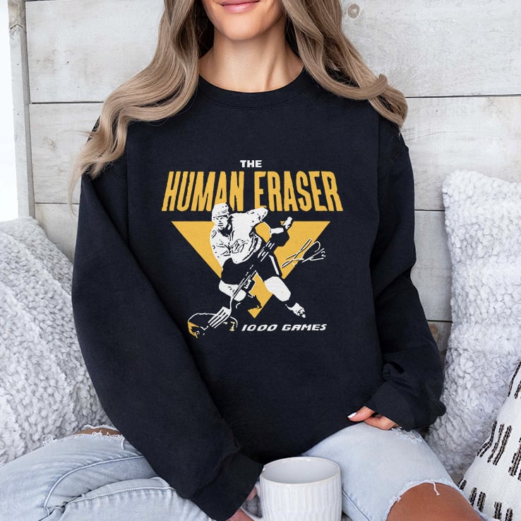 Jeff Beukeboom The Human Eraser 100 Games T Shirt refers to Jeff Beukeboom, a former NHL defenseman, known for his aggressive, hard-hitting play, earning him the nickname “The Human Eraser”.