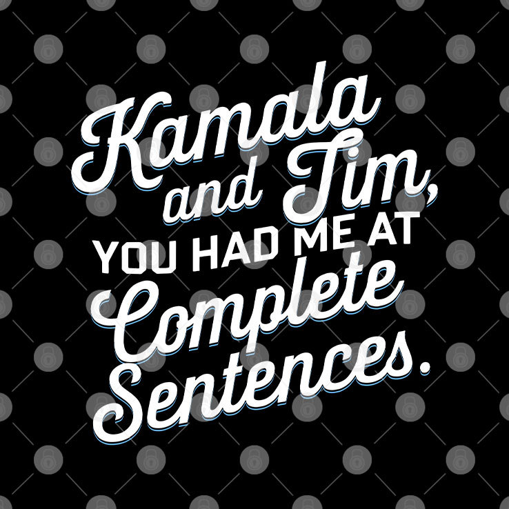 The phrase “You Had Me at Complete Sentences” wants to mention a campaign associated with Kamala Harris and Tim Walz, emphasizing clarity and communication in politics, contrasting with rhetoric that lacks substance.