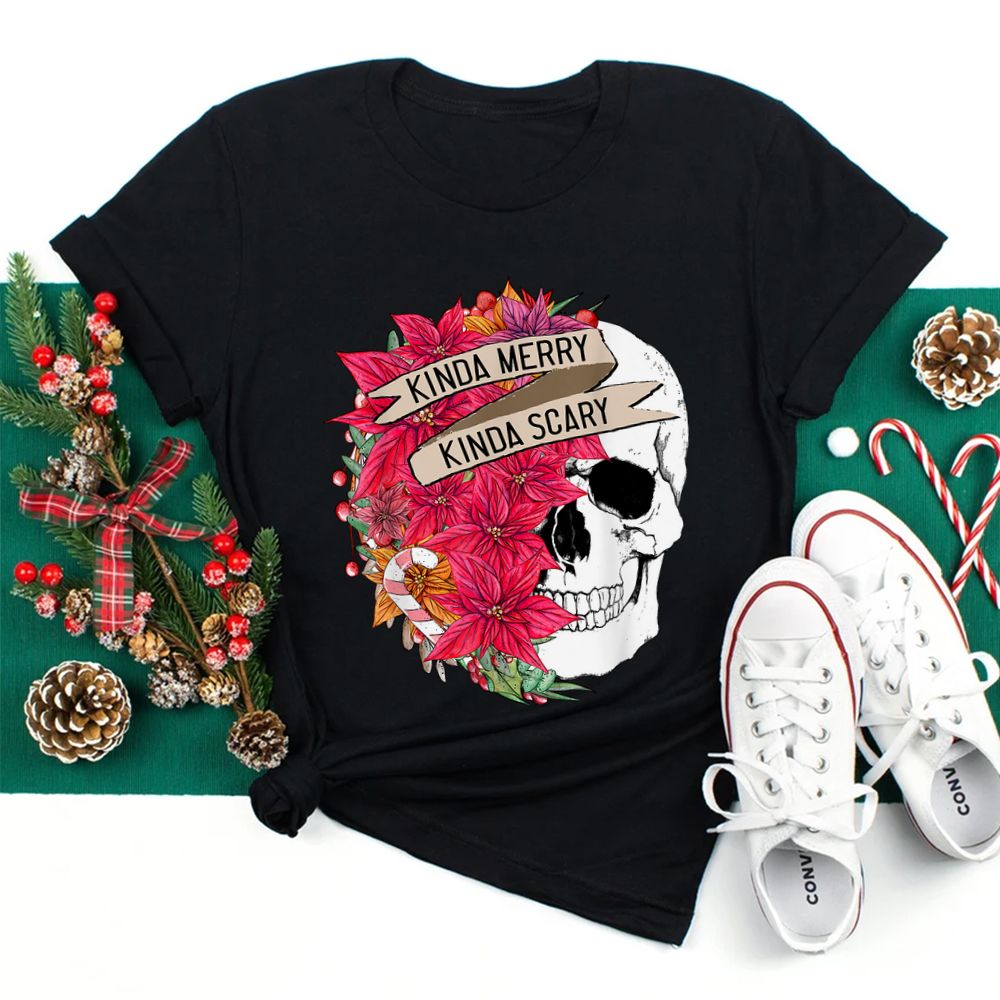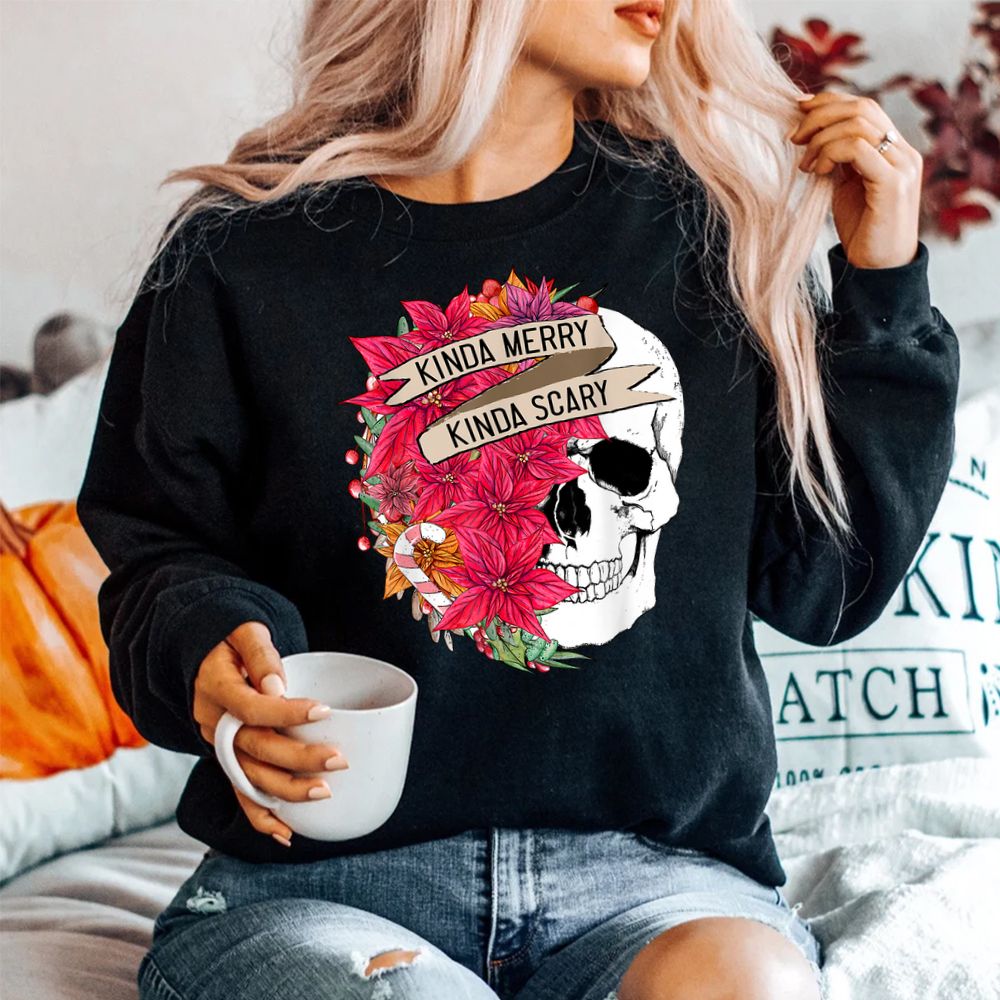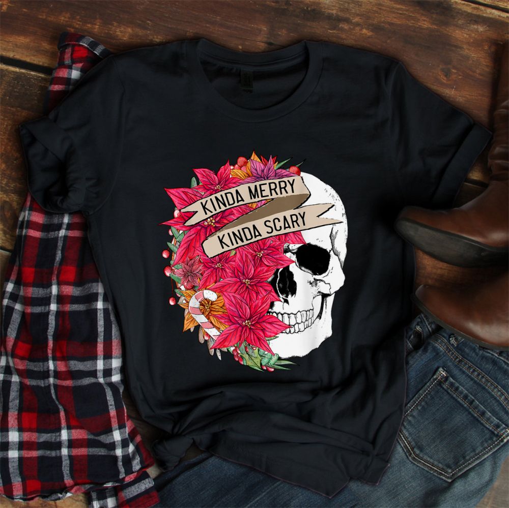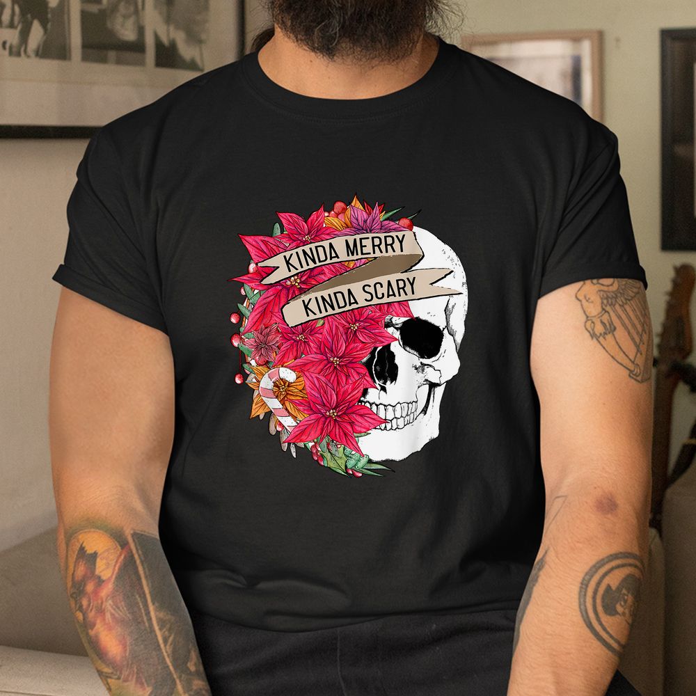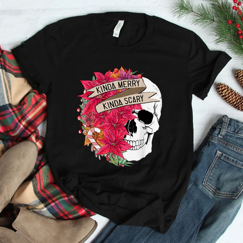 Kinda Merry Kinda Scare Skull Poinsettia Flower Christmas Shirt