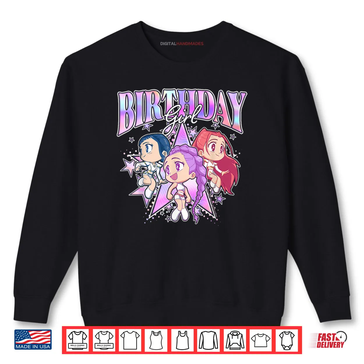 kpop demon hunters, birthday girl, chibi, adorable, anime, group shot, fan art, celebration, cute, shirt
