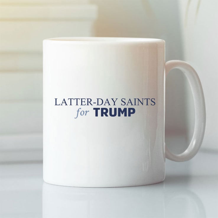 The mug proudly says “Latter-Day Saints For Trump”. Latter-Day Saints refers to members of the LDS Church, a Christian denomination founded in the 19th century by Joseph Smith. The church has a significant presence in the western U.S., particularly in Utah, and holds conservative values.