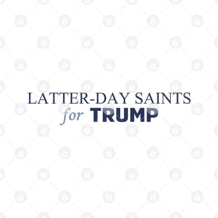 The phrase “Latter-Day Saints For Trump” implies political support for Donald Trump, who served as the 45th President of the United States from 2017 to 2021 and continues to run for president in the 2024 presidential election.