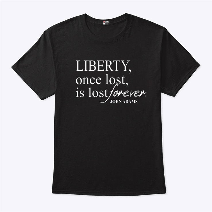 Liberty Once Lost Is Lost Forever John Adams T Shirt comes from a quote from a letter John Adams wrote to his wife Abigail Adams on July 7, 1775.