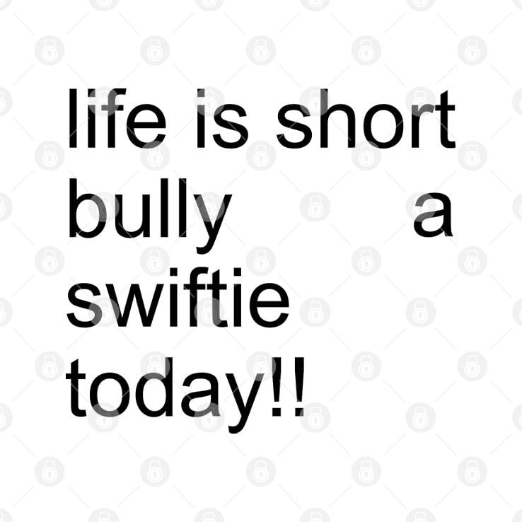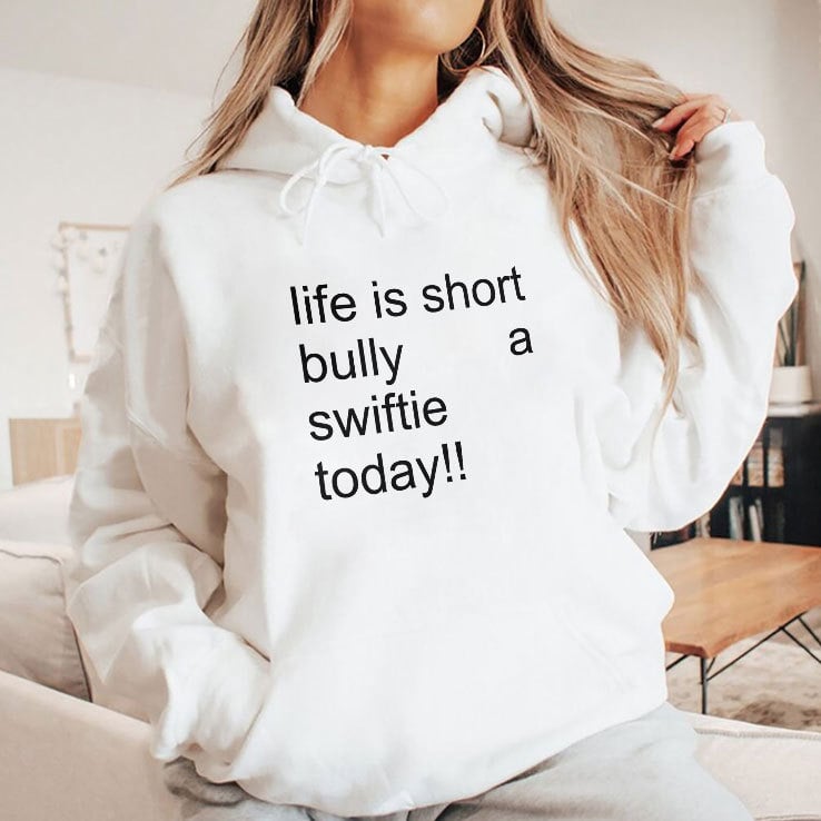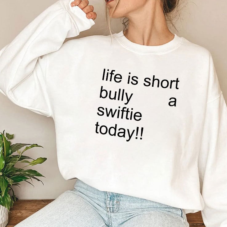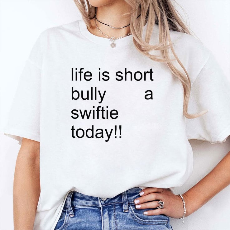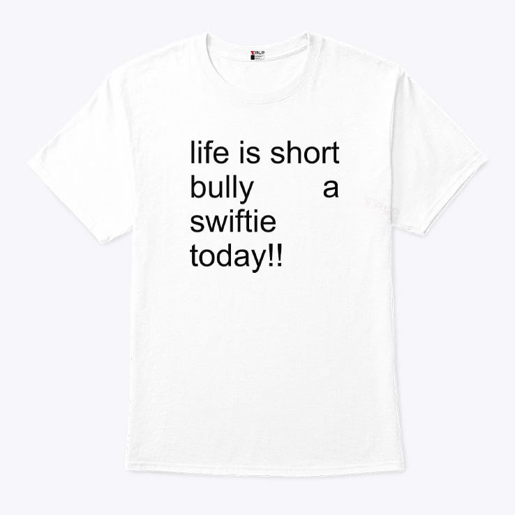 The shirt with the words “Life is Short, Bully a Swiftie Today” is meant to be humorous and ironic. It plays off the idea of “bullying” Swifties, who are fans of Taylor Swift, but the phrase is often not meant to be taken literally.