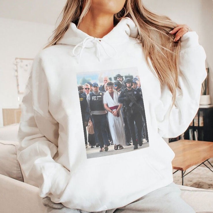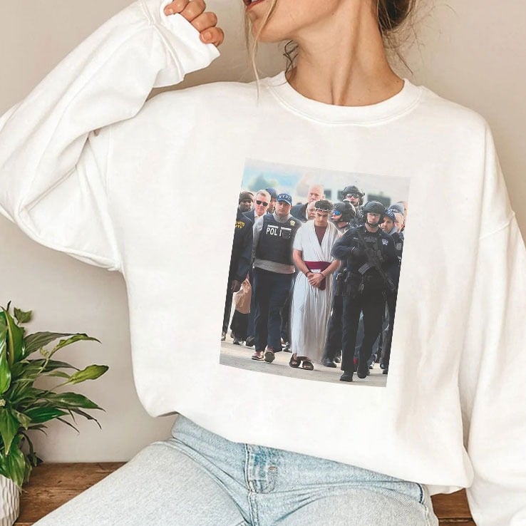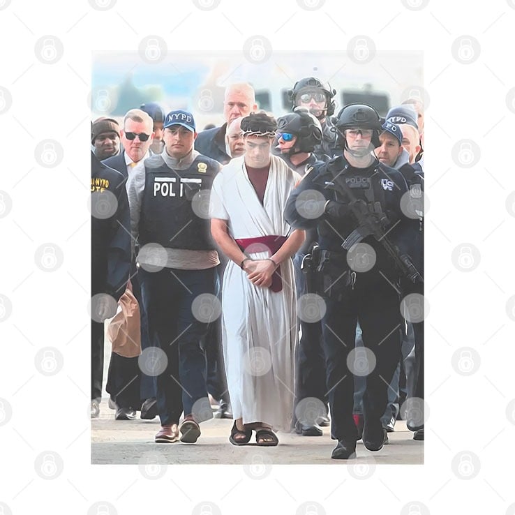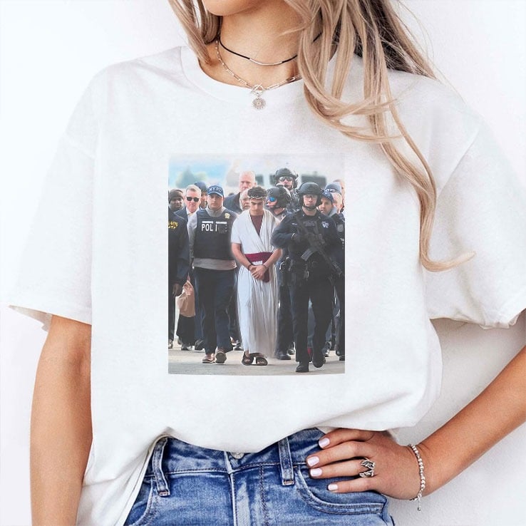 The t-shirt depicts an image of Luigi Mangione as Christ. Luigi Mangione is an American man who was initially identified as a person of interest and later as a suspect in the murder of Brian Thompson, the CEO of United Healthcare.