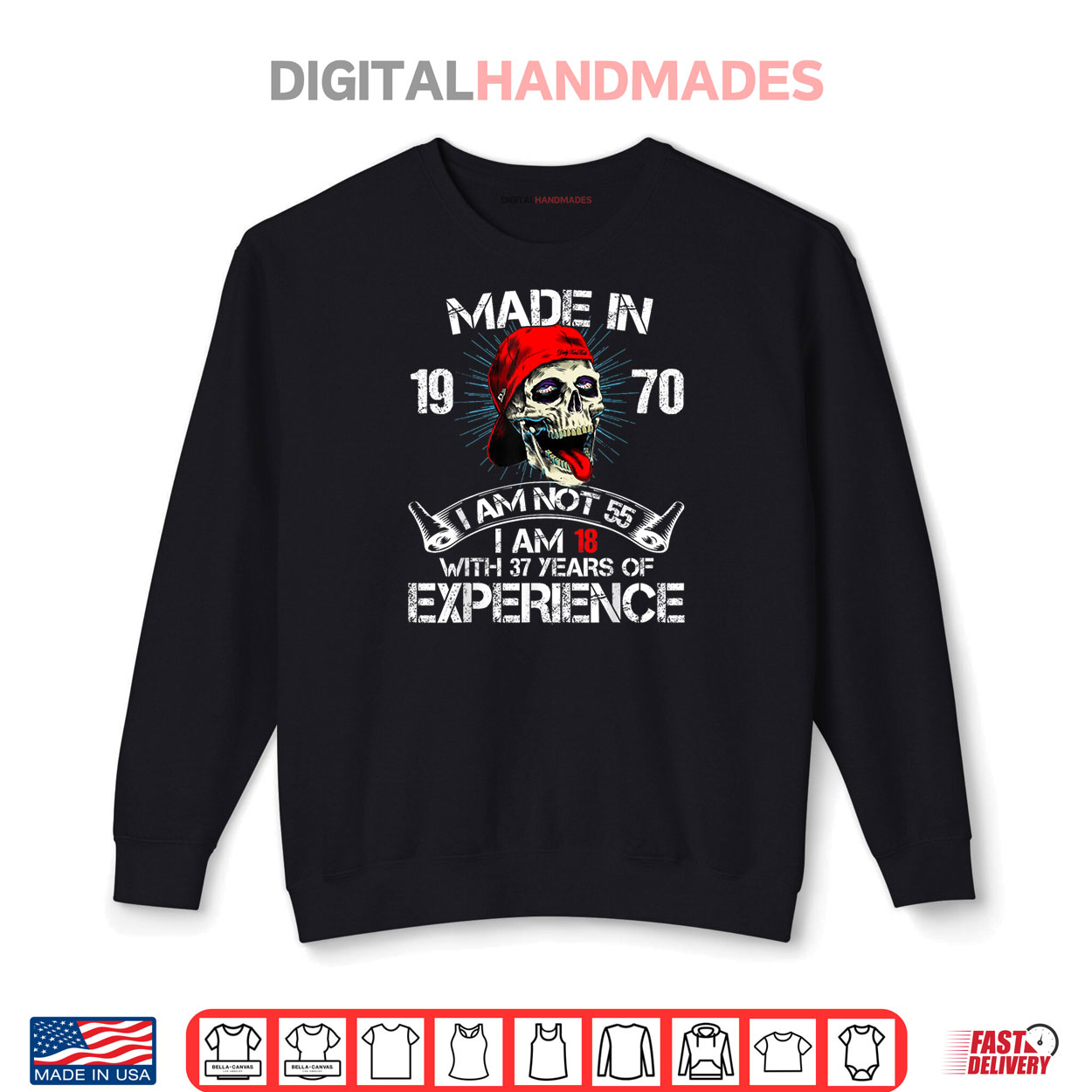 made in 1970 not 55, 18 with 37 years graphic tee, spring celebration apparel, funny birthday humor shirt, bold 1970 design, playful casual spring fashion, lighthearted retro tee, springtime quirky style, humorous experience shirt, cute vintage apparel