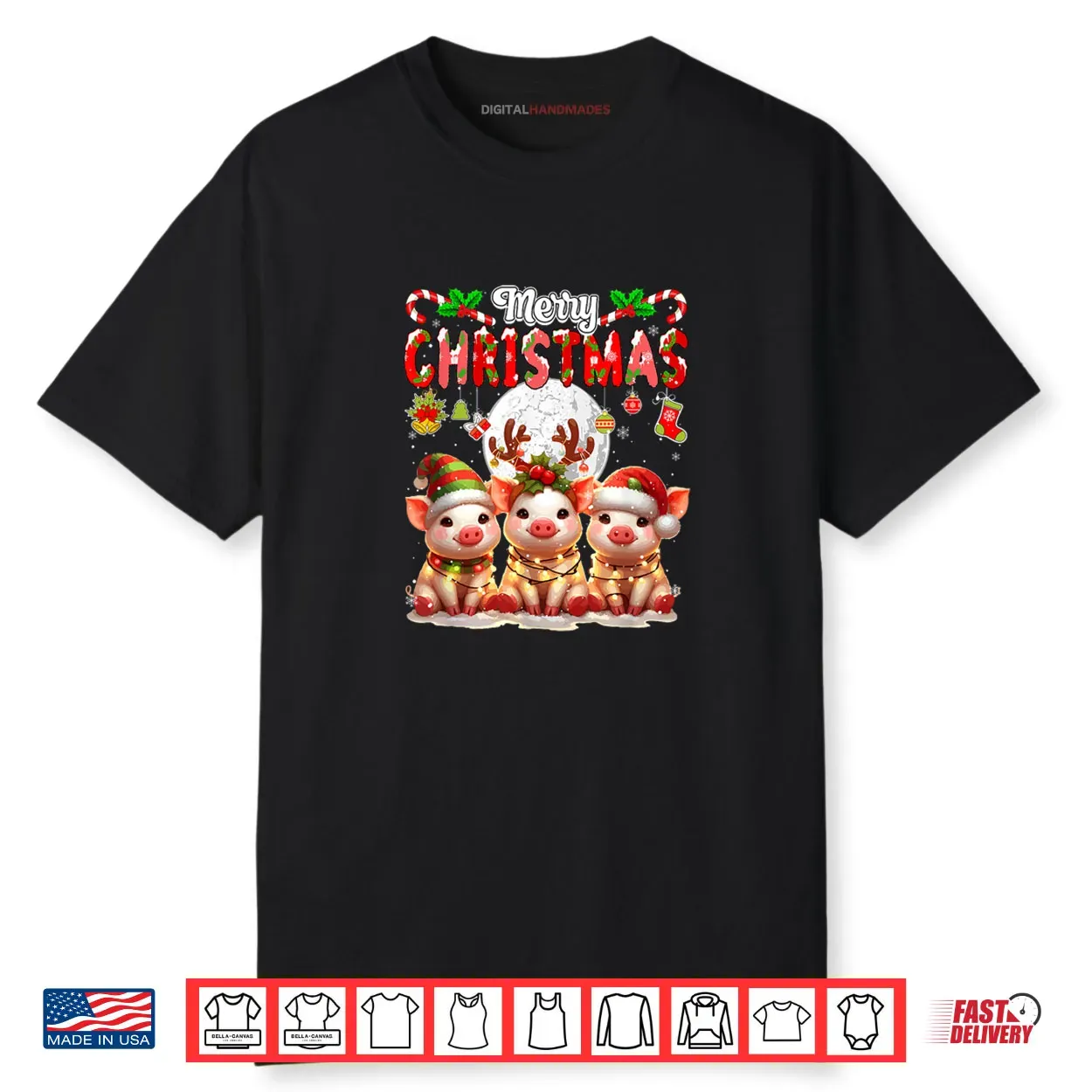 Merry Christmas Three Santa Reindeer Elf Pigs Colorful Shirt