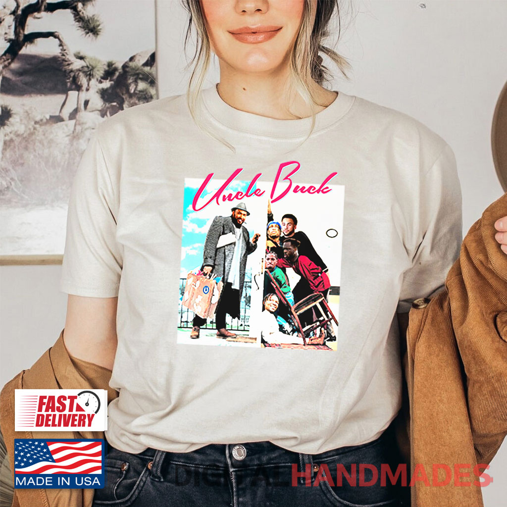 The character Uncle Buck is known for being a lovable, unconventional caretaker. It makes the shirt a fun blend of football fandom and classic cinema.