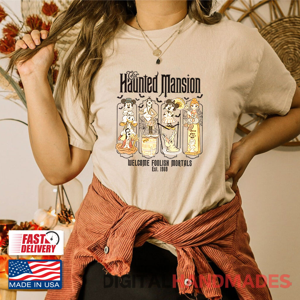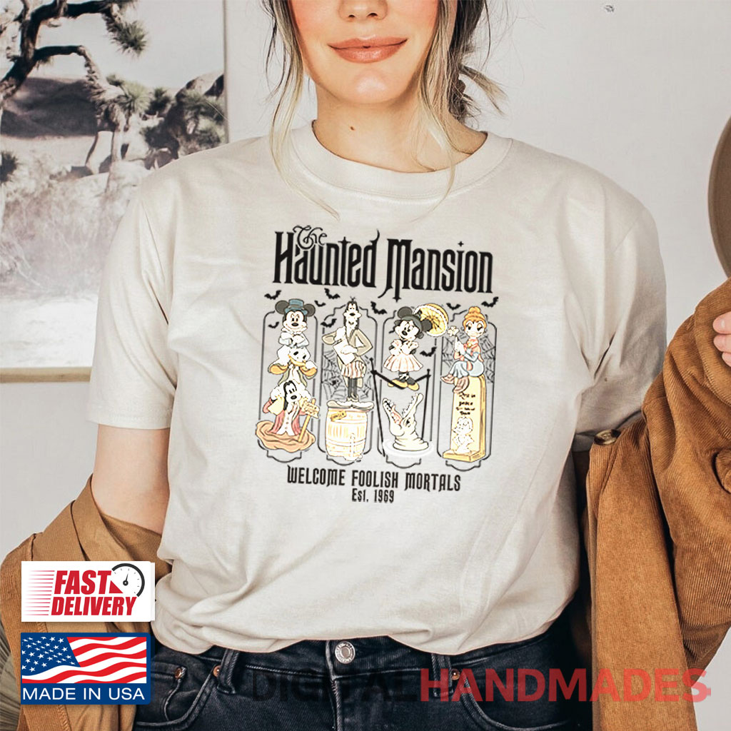 The shirt features the characters of Mickey Mouse’s film and the phrase “Haunted Mansion Welcome Foolish Mortals Est 1969”. It is a combination of Mickey Mouse and Disney’s Haunted Mansion attraction.