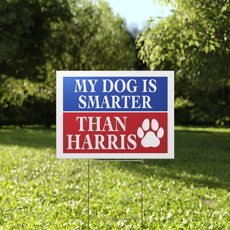 The yard sign uses humor and exaggeration to express disapproval or frustration with Kamala Harris by implying that even your dog is more intelligent than her. This type of slogan clearly reflects one’s political views, typically aligning with those who oppose Harris and her policies.