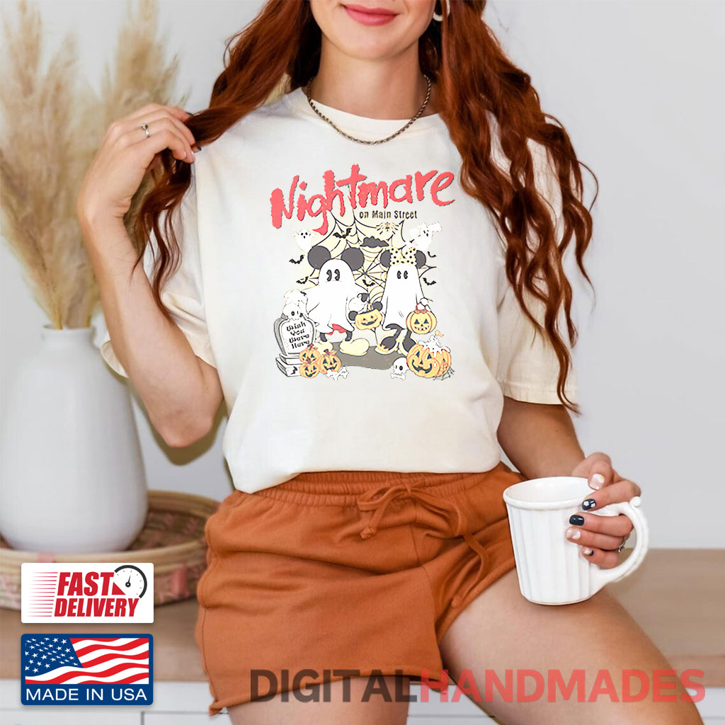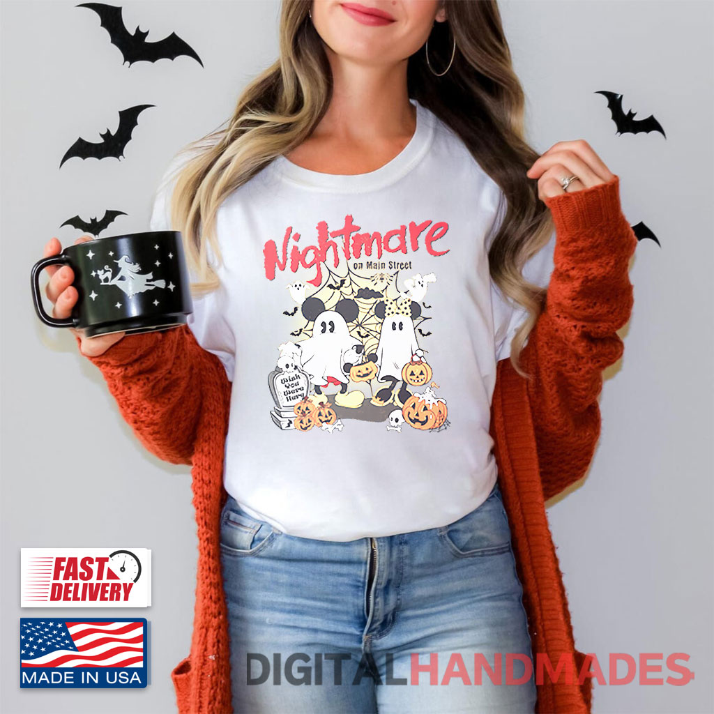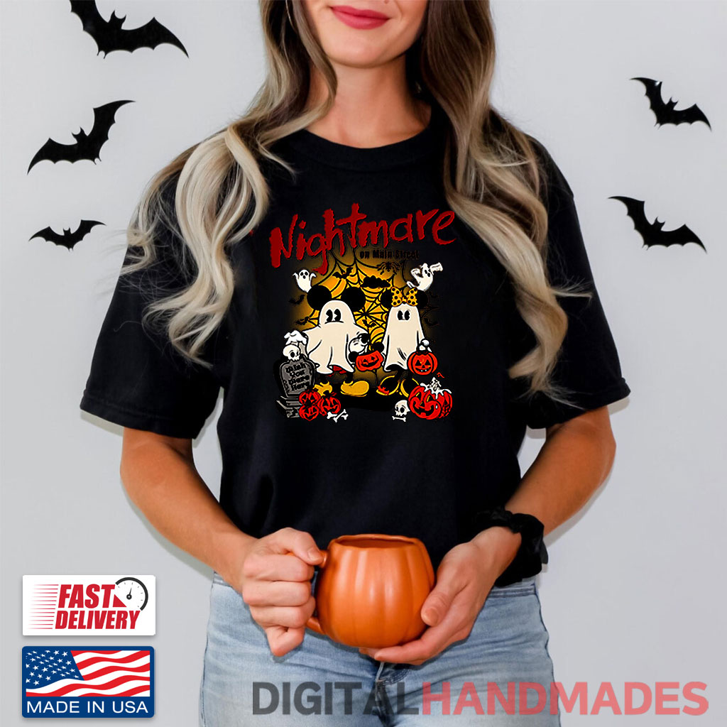 The shirt features the ghosts holding pumpkins and the phrase “Nightmare On The Main Street”. The design features a unique Halloween-themed graphic, inspired by classic horror elements.
