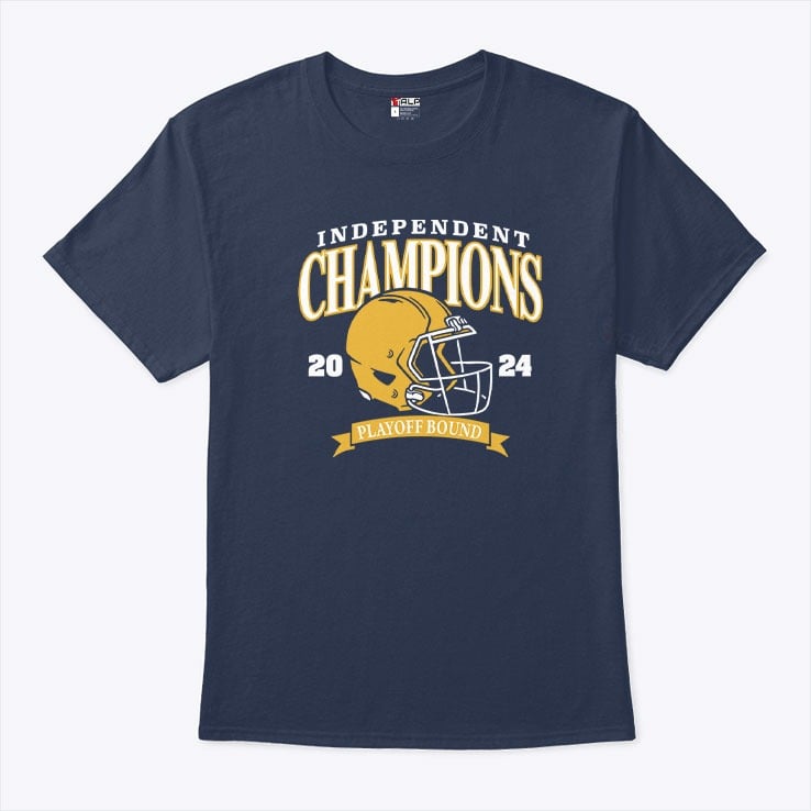 The t-shirt depicts the image of Notre Dame Fighting Irish helmet and the phrase “Independent Champions Playoff Bound 2024”. It refers to the University of Notre Dame’s football team, one of the most iconic and successful programs in college football history.