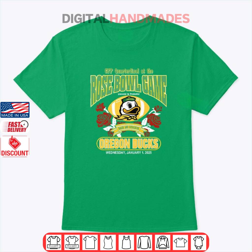 The shirt features the Oregon Ducks team and the words “Quarterfinal At The Rose Bowl Game Roses and Rivalries“, It celebrates the Oregon Ducks’ participation in the College Football Playoff (CFP) quarterfinals, specifically the prestigious Rose Bowl game.