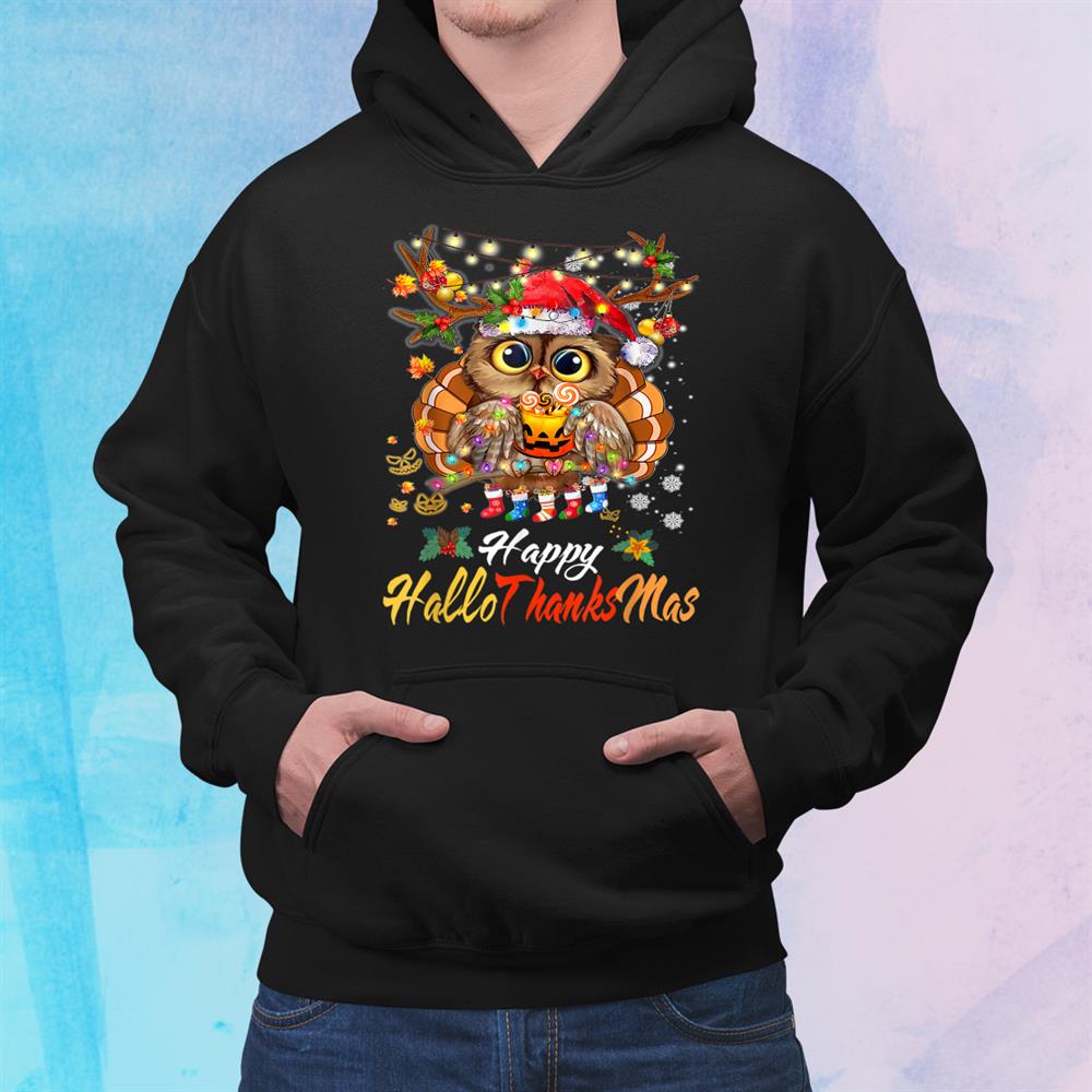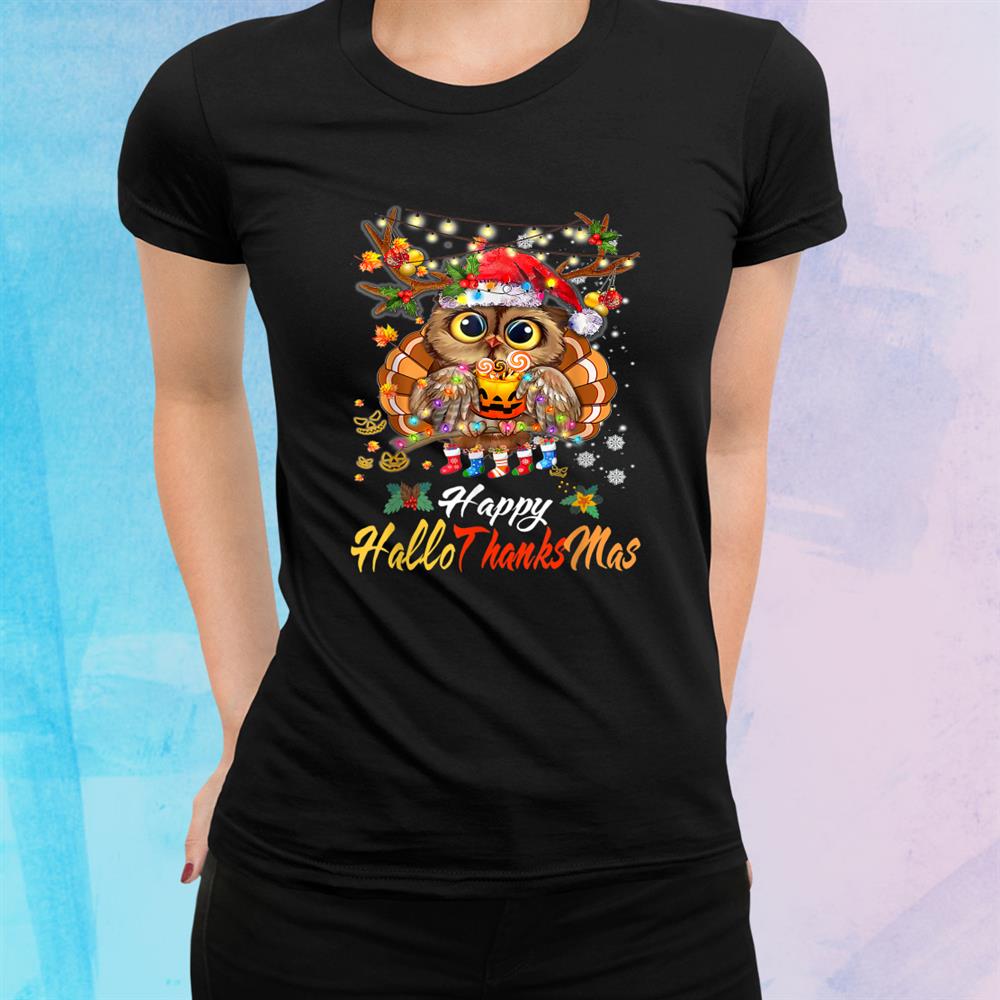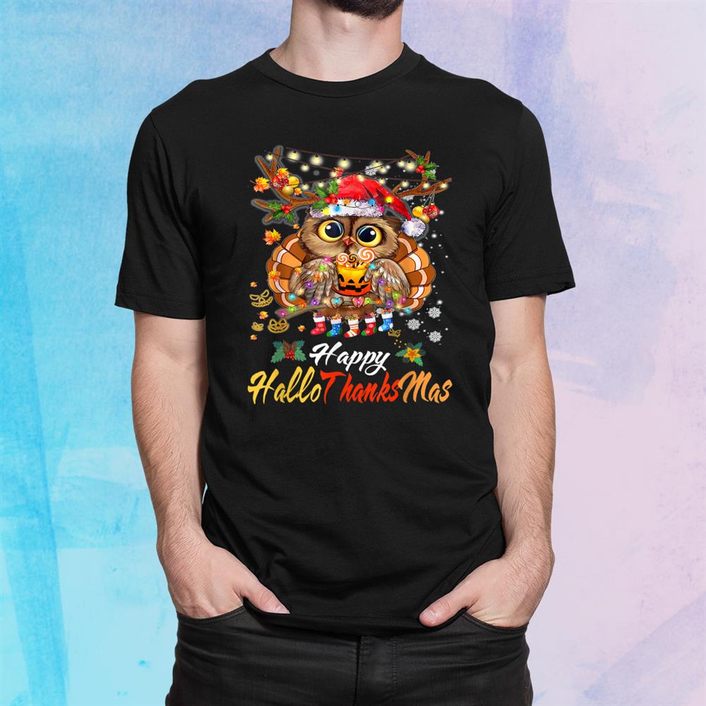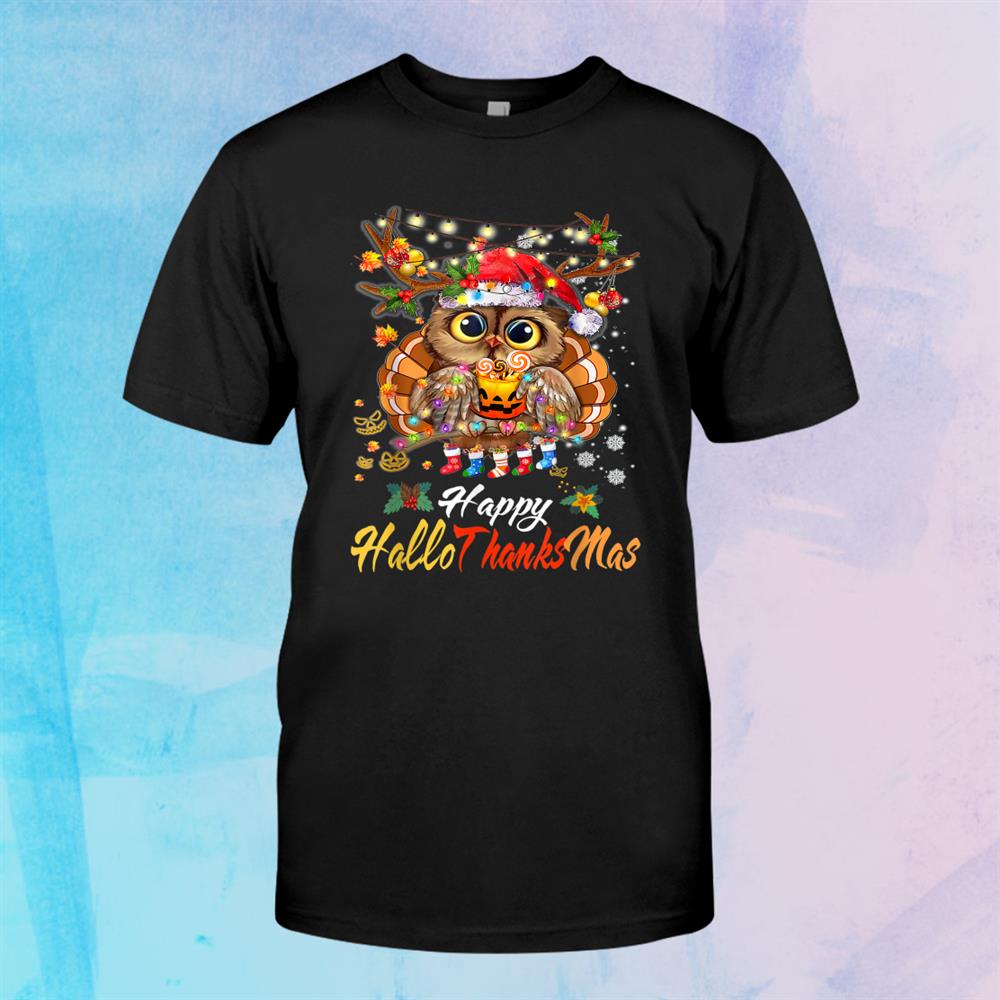 Owl Thankgiving Halloween Christmas Happy Hallothanksmas Shirt, hoodie, sweatshirt, long sleeve and ladies T-shirt