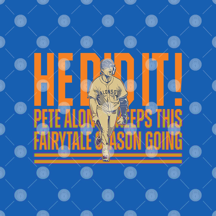 The shirt features Pete Alonso and the phrase “He Did It Keeps This Fairytale Season Going“, which relates to refers to a significant home run hit by New York Mets player Pete Alonso during the 2024 MLB season.