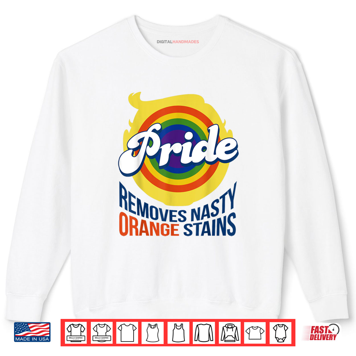 Pride Removes Nasty Orange Stains Pride Month LGBTQ Shirt, Anti Trump Pride Removes Orange Stains Tee Top Shirt, LGBTQ Pride Month Political Humor Wear Fun Shirt, Nasty Orange Stain Remover Joke Style Proud Shirt, June Pride Protest Slogan Apparel Fan Lady Shirt, Impeach The Orange Stain Parody Chic Sweet Cute Shirt, Rainbow Against Trumpism Vintage Love Heart Ride Shirt, Activist For Equality And Pride Hip Hop Rule Lady Shirt, Humorous Political Cleansing And Love Proud Fan Chic Sweet Shirt, Progressive Pride And Protest Cute Love Heart Ride Hip Hop Shirt