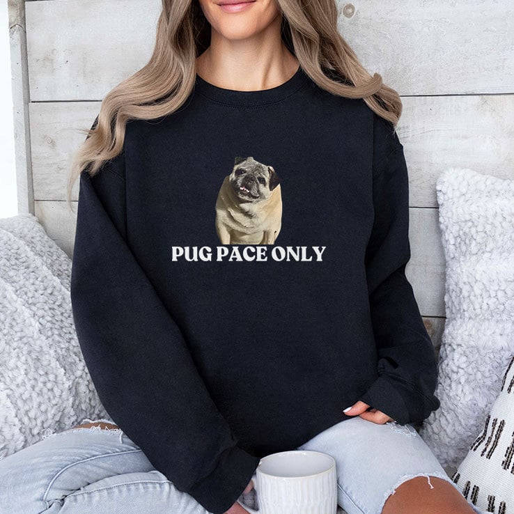 The shirt features a pug and the words “Pug Pace Only“, which is intended for pug lovers. The term “pace” refers to the way pugs often pace around due to their energetic or curious nature.