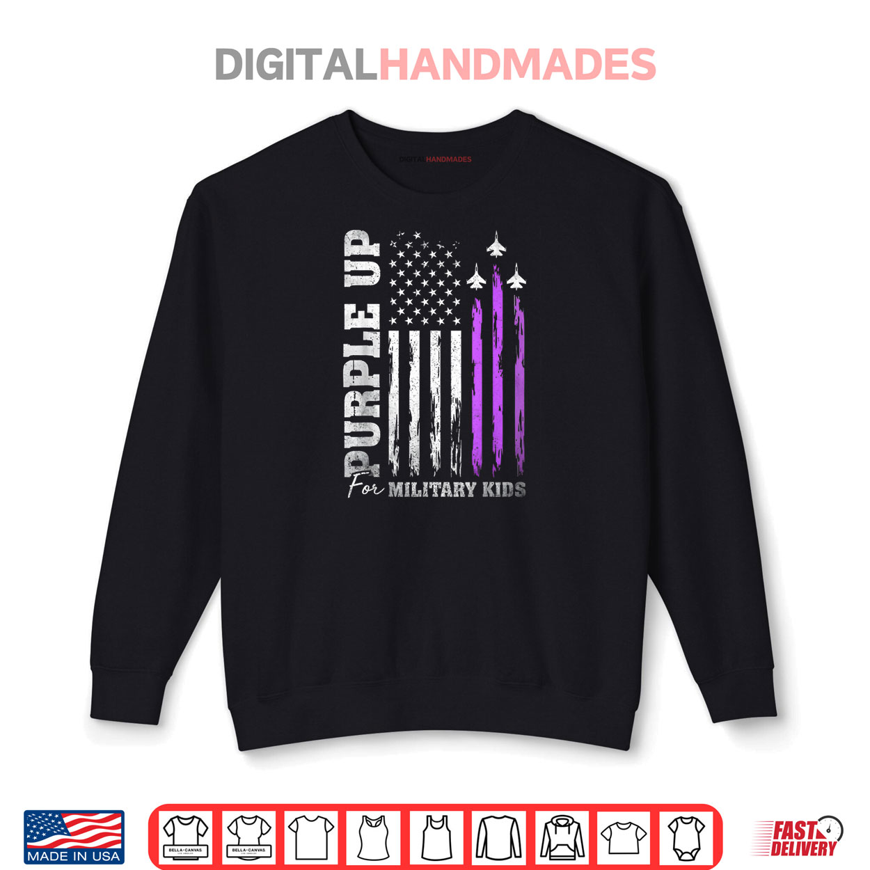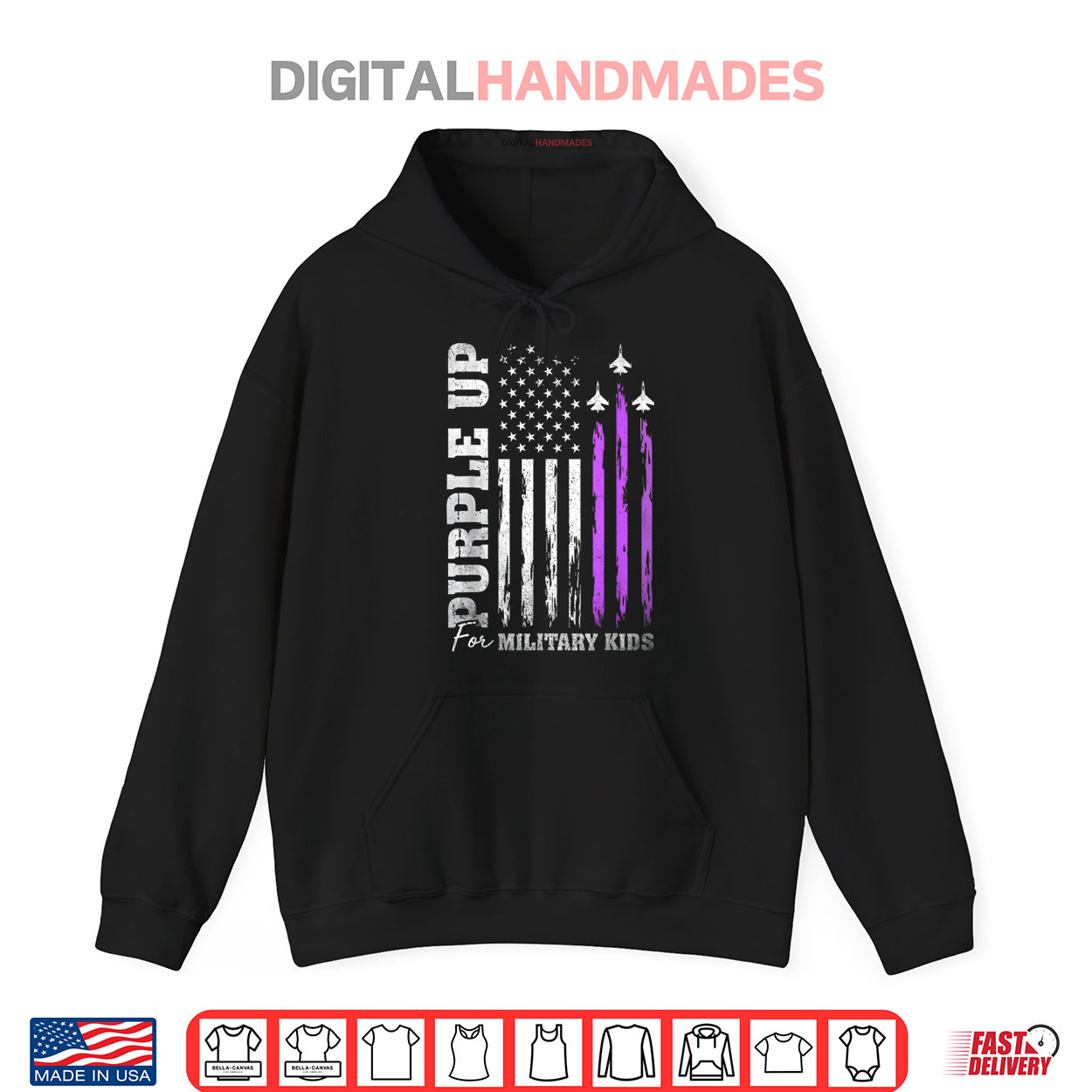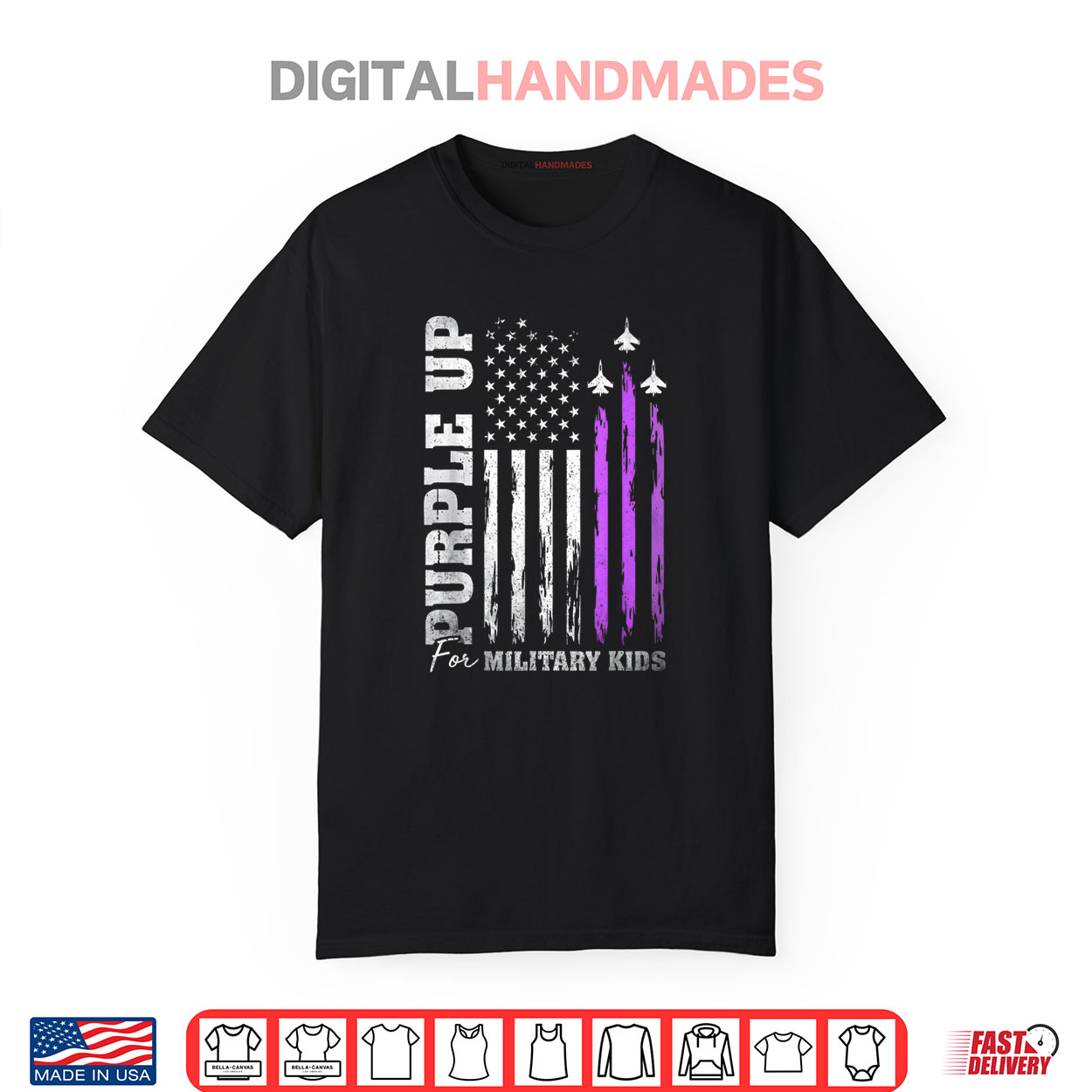 purple up military kids flag, child month graphic tee, spring supportive apparel, funny military humor shirt, bold purple flag design, playful casual spring fashion, lighthearted kids tee, springtime military style, humorous purple shirt, cute support apparel