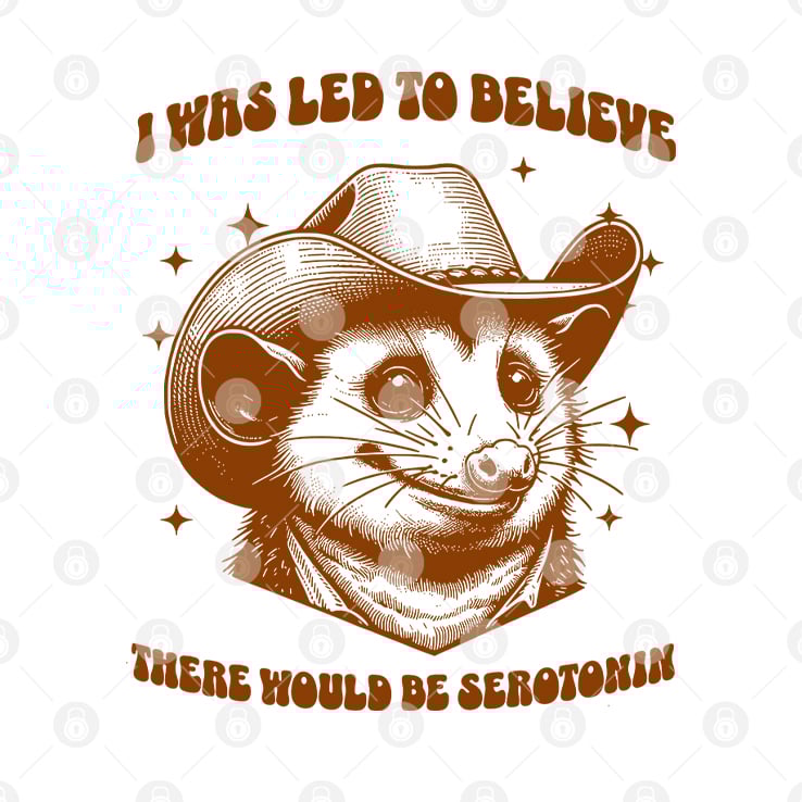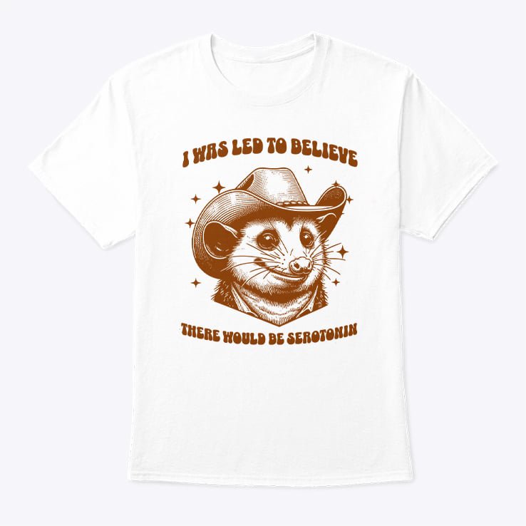 The t-shirt features the image of a raccoon and the phrase “I Was Led To Believe There Would Be Serotonin”. Serotonin is a neurotransmitter, a chemical in the brain that plays a key role in regulating mood, emotions, and overall well-being. It helps to stabilize mood, feelings of happiness, and anxiety, and also contributes to other functions like sleep, appetite, and digestion.