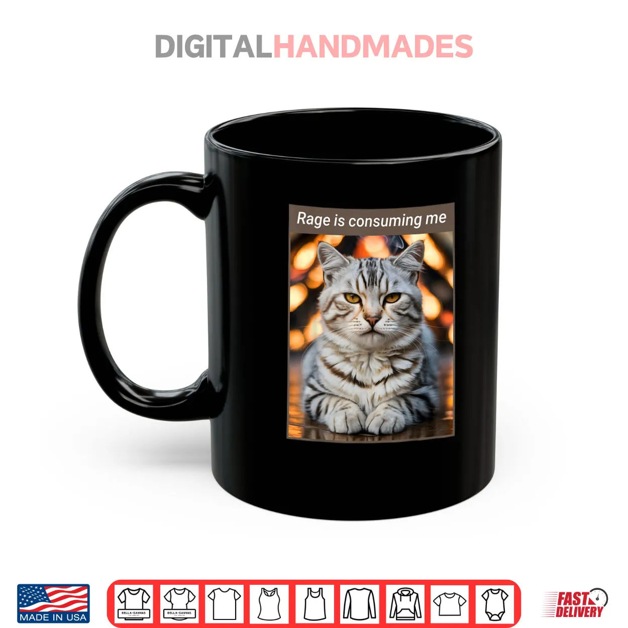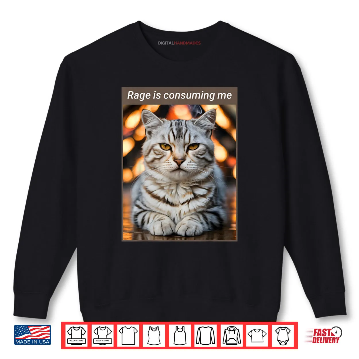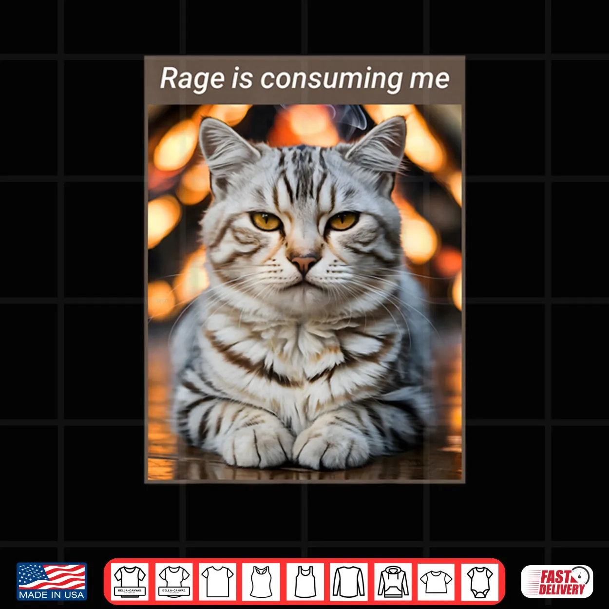 rage is consuming me, meme cat, angry feline, relatable, internet humor, moody, dark humor, funny animal, emotion, shirt