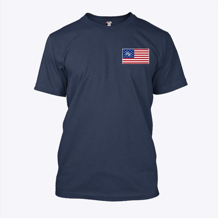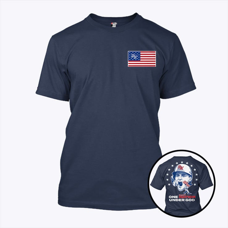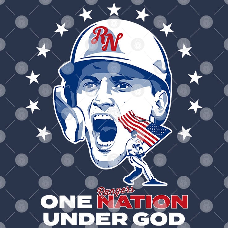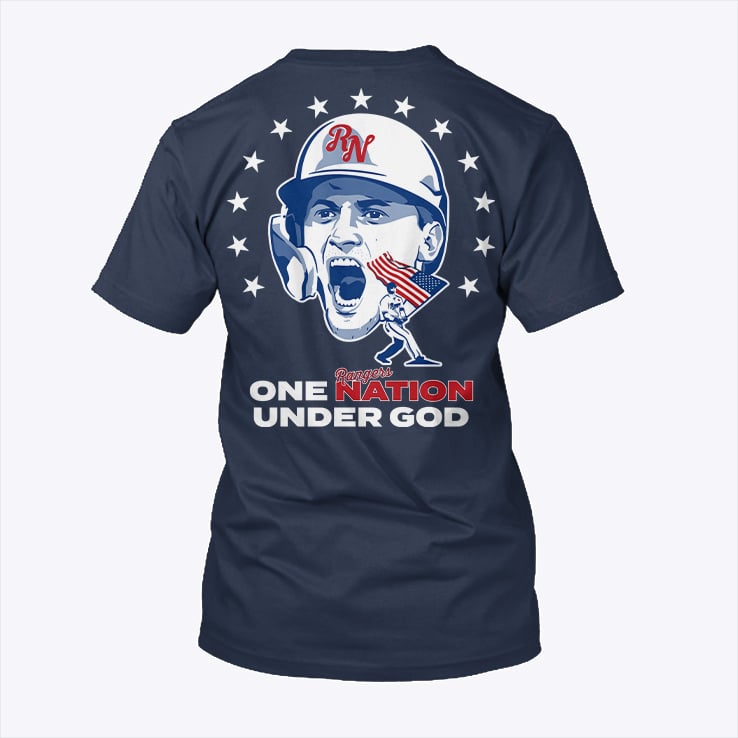 The t-shirt features the logo of Rangers Nations and the phrase “One Nation Under God” and the Stars & Stripes. In Major League Baseball (MLB), “Rangers Nation” refers to fans of the Texas Rangers, a professional baseball team based in Arlington, Texas.