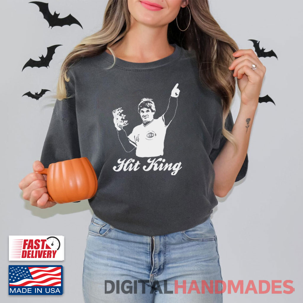 The t-shirt features an image of Pete Rose and the phrase “hit king”. Peter Rose was an American professional baseball player and manager. Pete Rose played primarily for the Cincinnati Reds but also had time with the Philadelphia Phillies and the Montreal Expos.