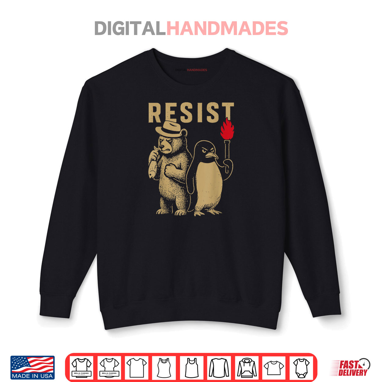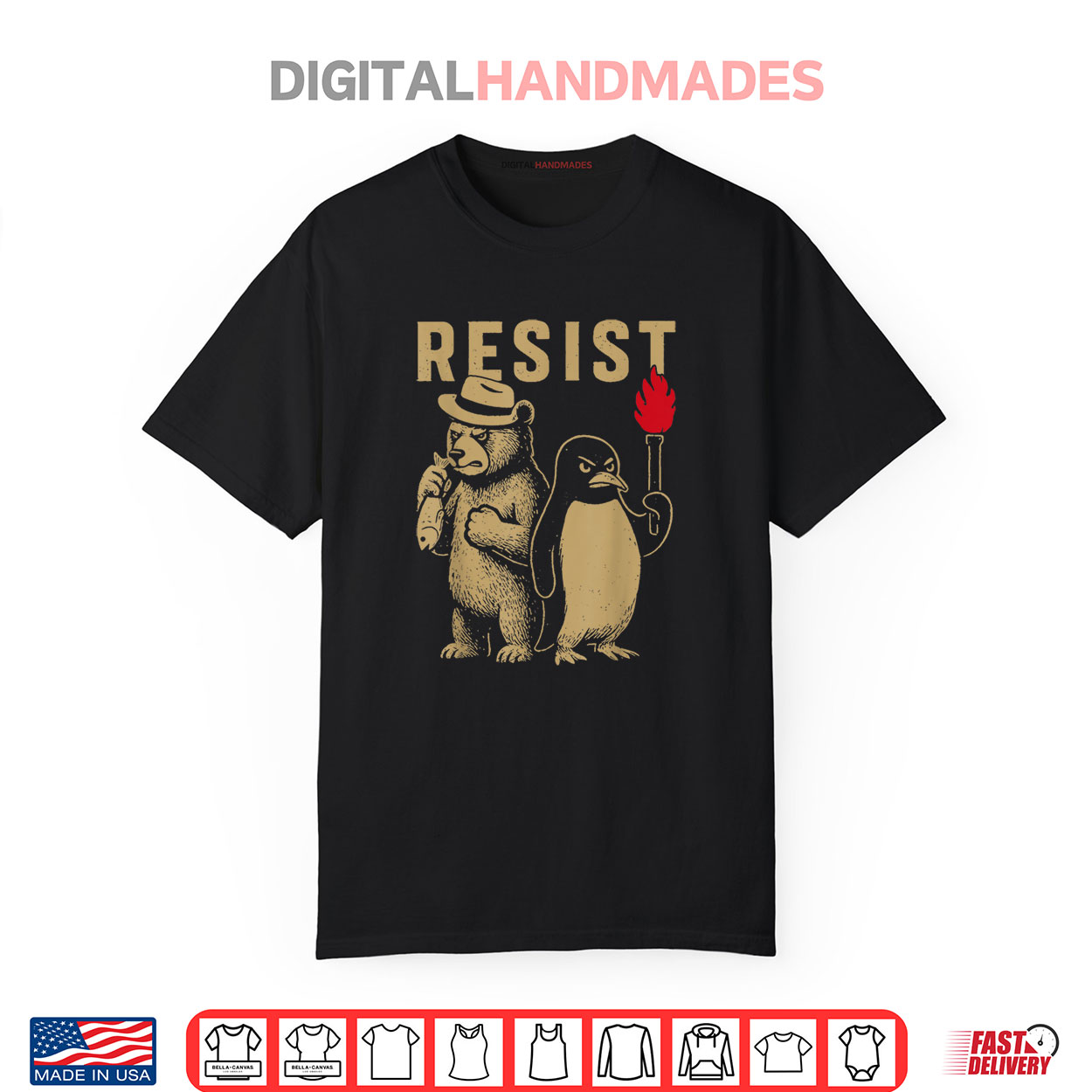 resist penguins bear graphic shirt, we stand with penguins tee, protest animals graphic shirt, political animal parody shirt, resist movement tee, pro-nature activism shirt, resist cute animal shirt, bear and penguin graphic tee, animal rights humor shirt
