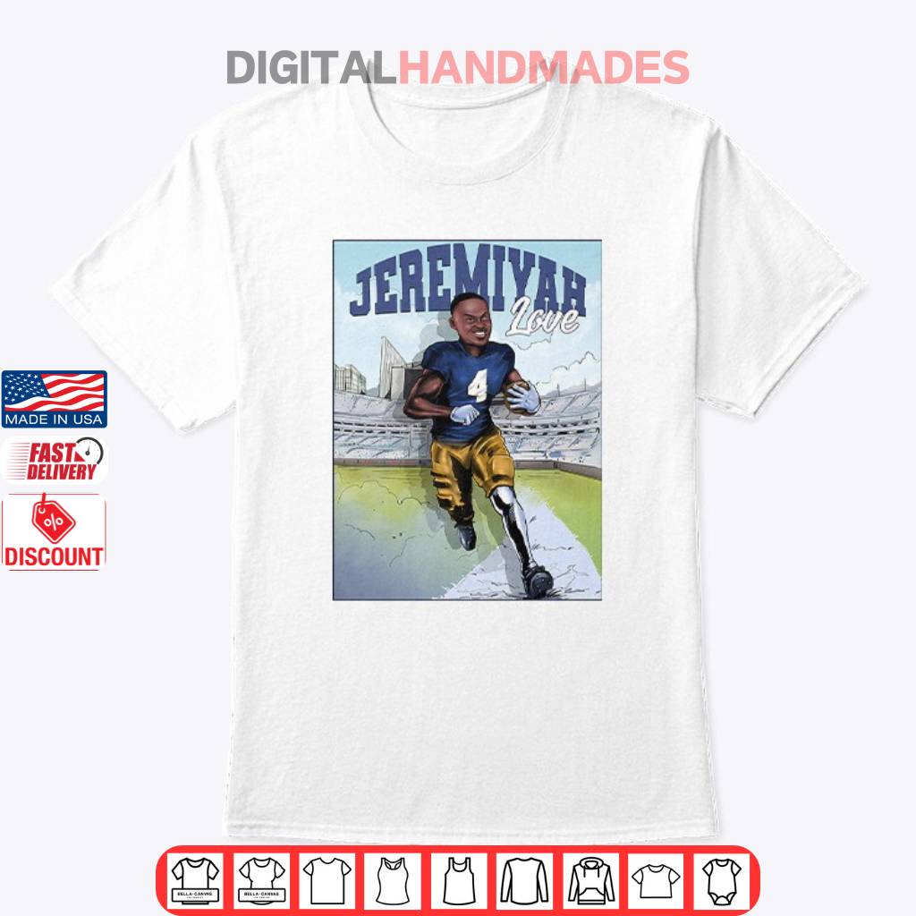 The t-shirt depicts a cartoon image of Jeremiyah Love along with his name. It was proudly worn by Riley Leonard. Both of them are playing for Notre Dame Fighting Irish football.