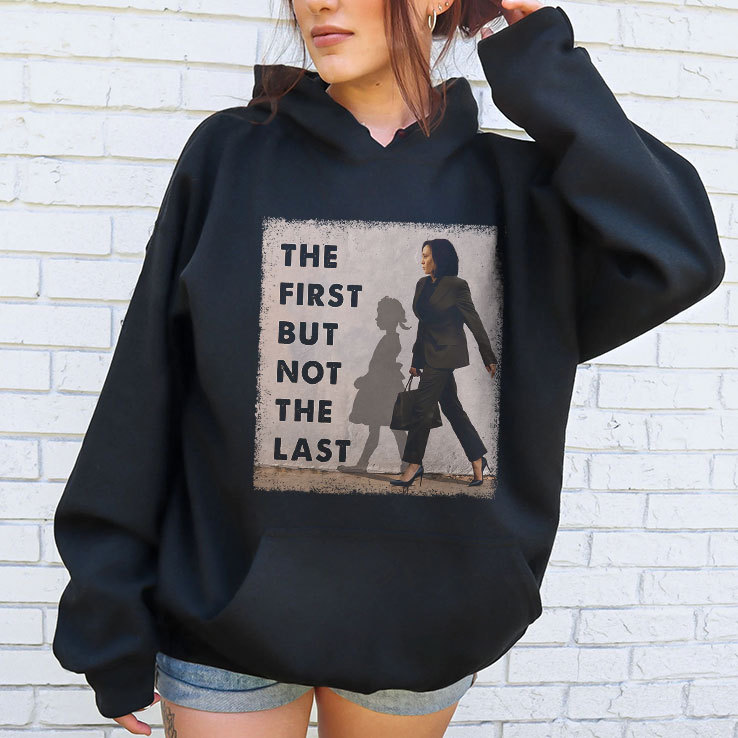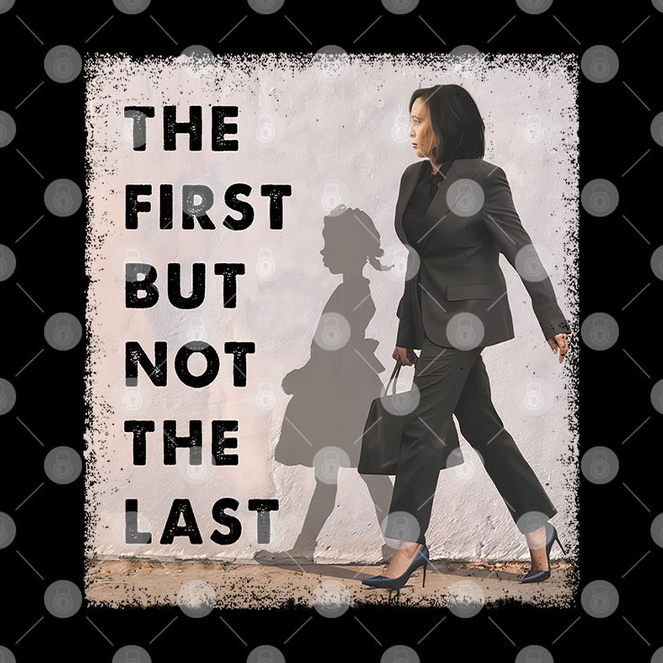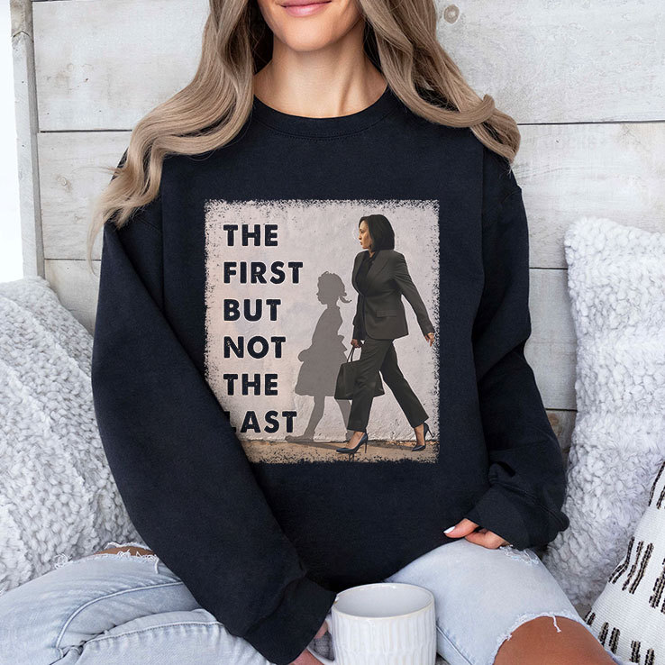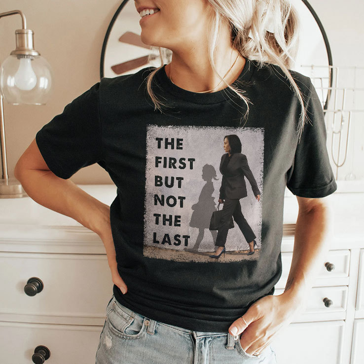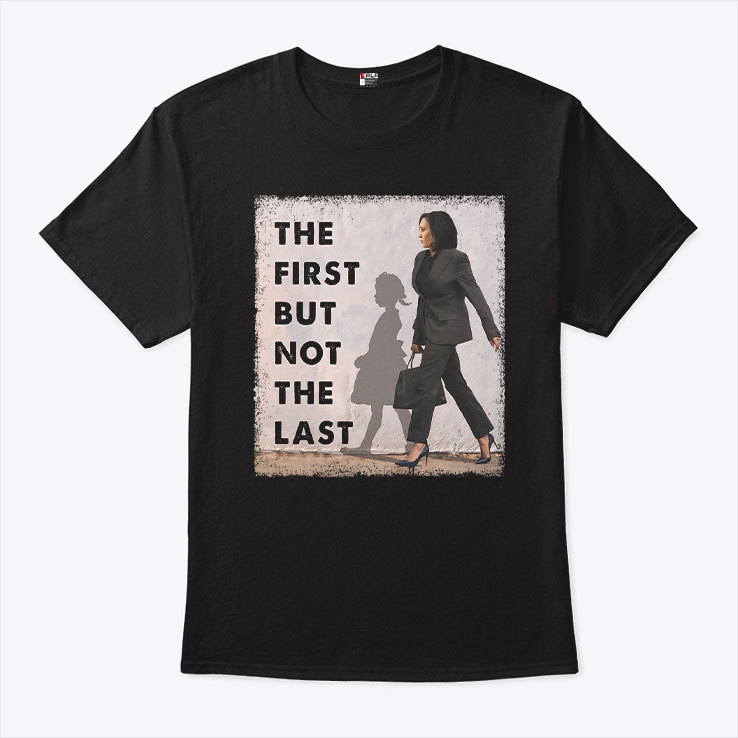 The t-shirt stands out with the image of Ruby Bridges And Kamala Harris walking and the phrase “The First But Not The Last”.