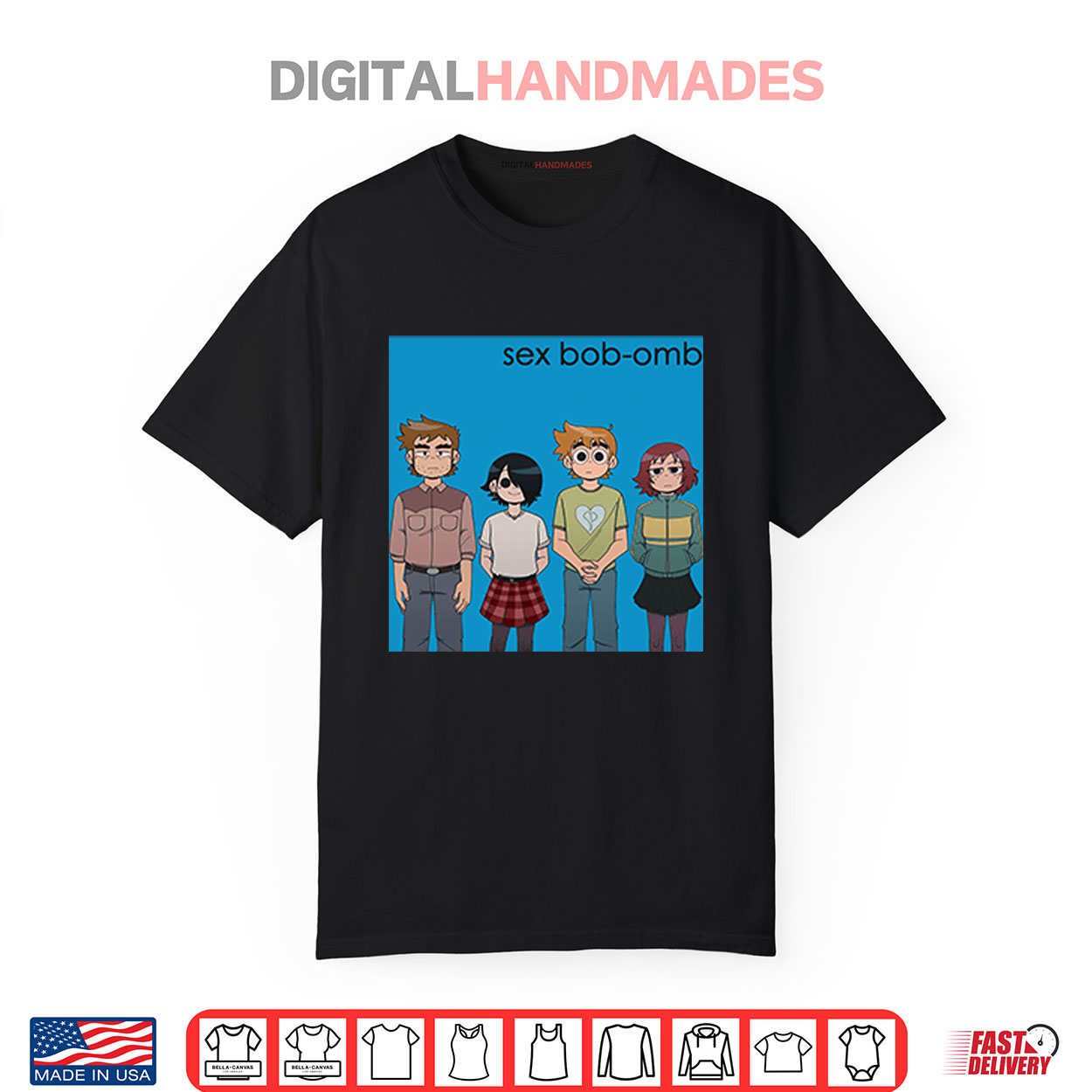 sex bob omb music fandom, comic-inspired graphic tee, spring band apparel, funny bob omb humor shirt, playful retro design, bold casual spring fashion, lighthearted band tee, springtime music style, humorous sex bob shirt, cute fandom apparel