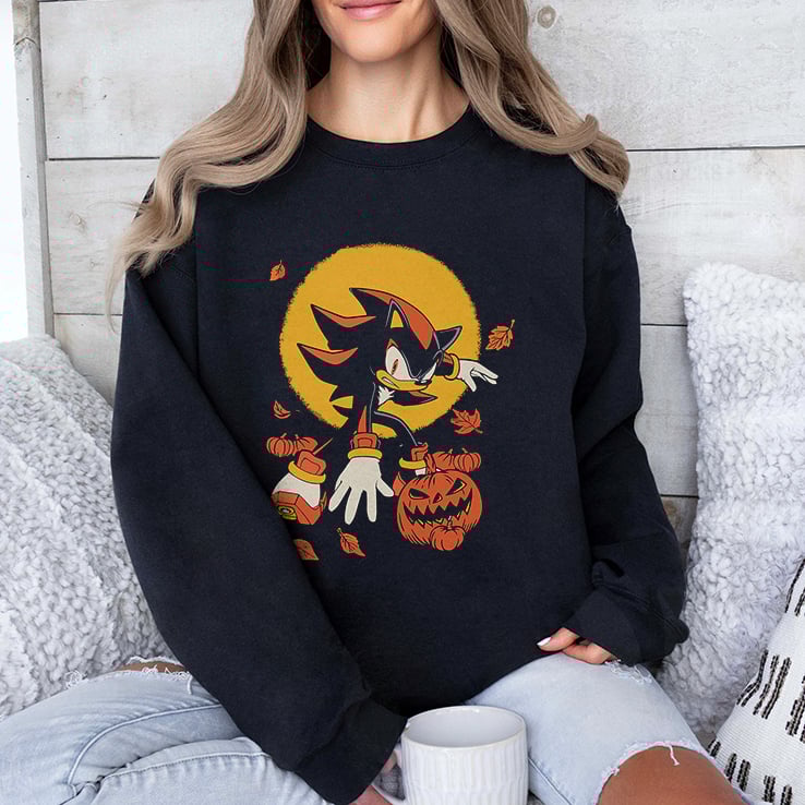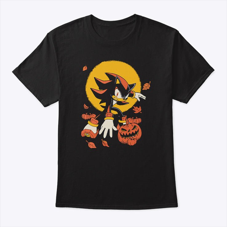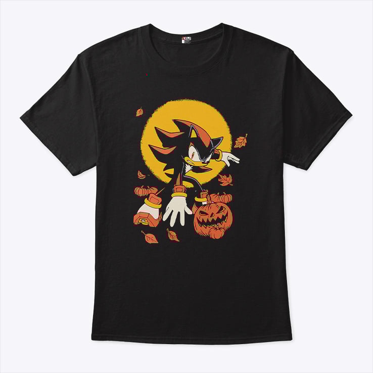 The t-shirt stands out with the image of Shadow the Hedgehog and Pumpkin for Halloween. Shadow the Hedgehog is a fictional character from the “Sonic the Hedgehog” video game franchise, created by Sega.
