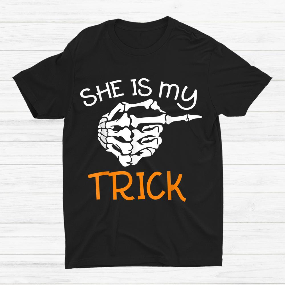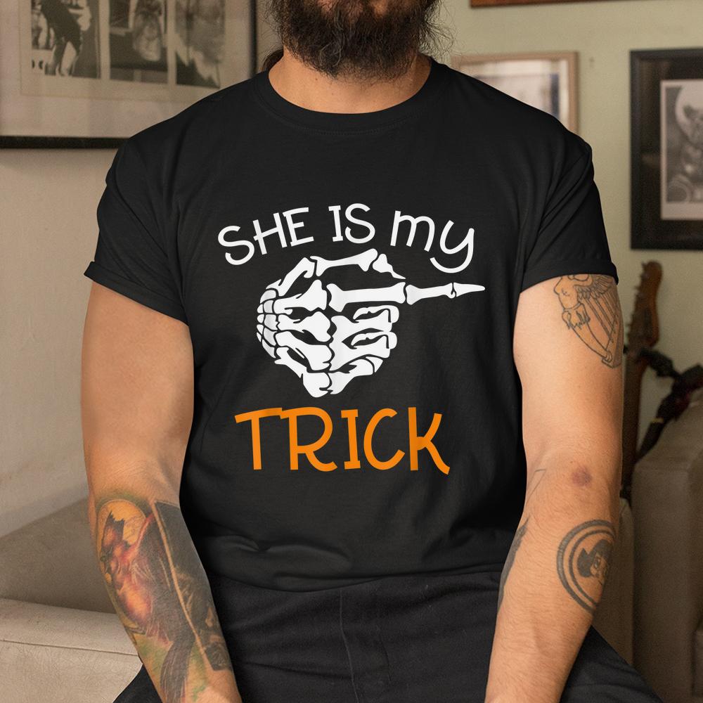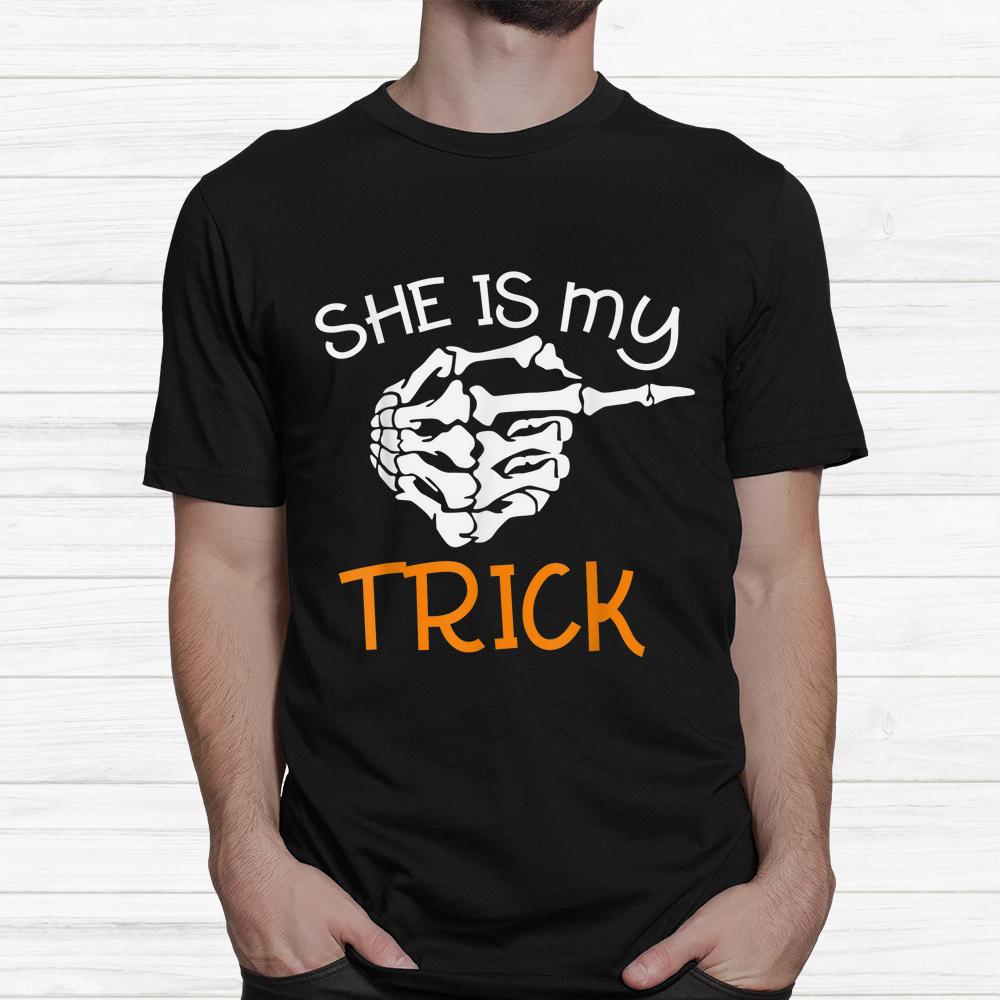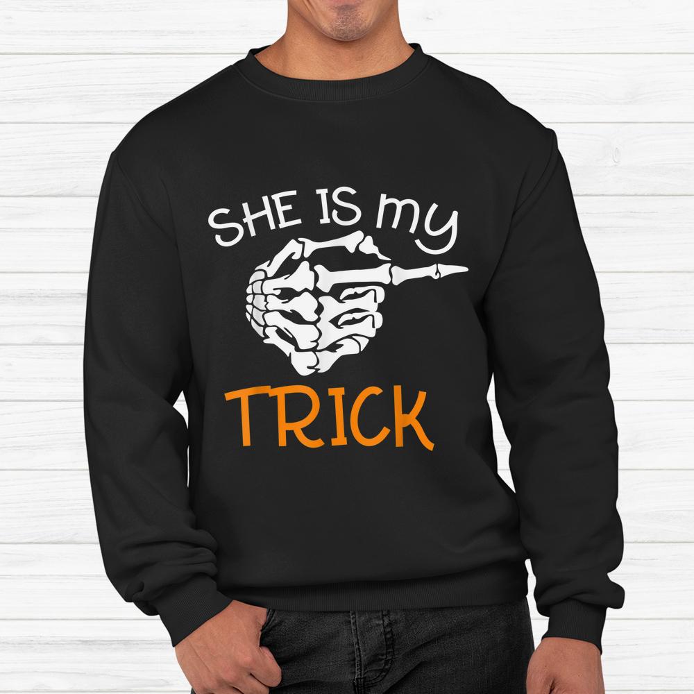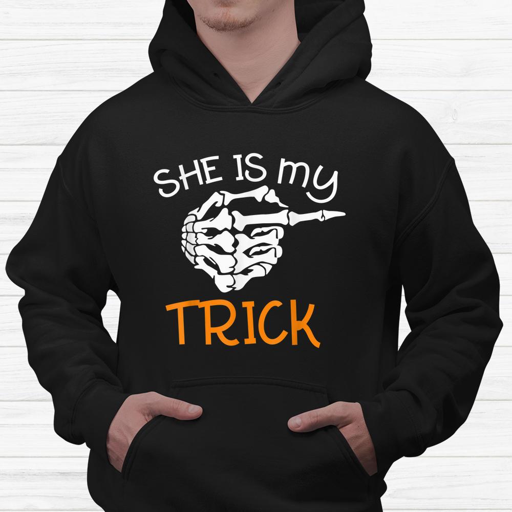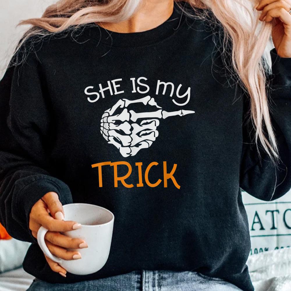 Shes My Trick Halloween Night Costume Skeleton Finger Shirt, hoodie, sweatshirt, long sleeve and ladies T-shirt