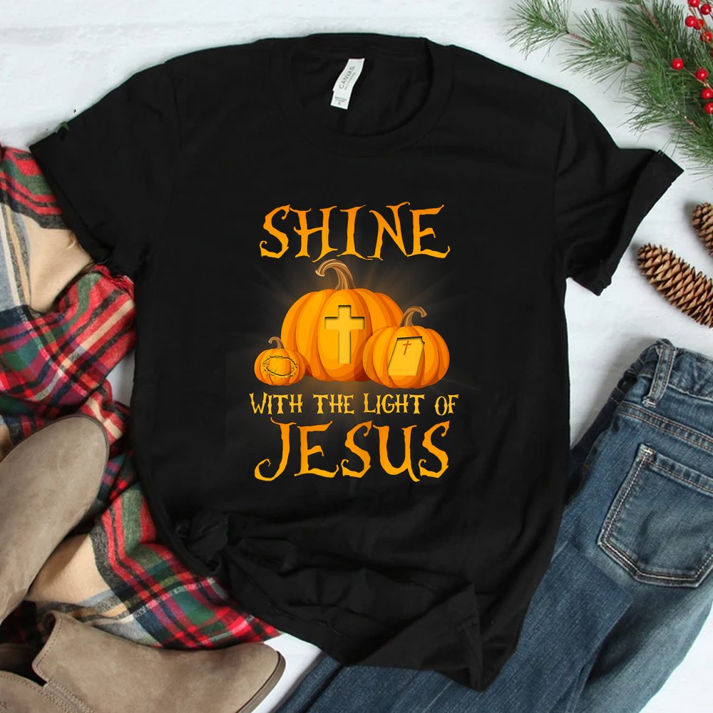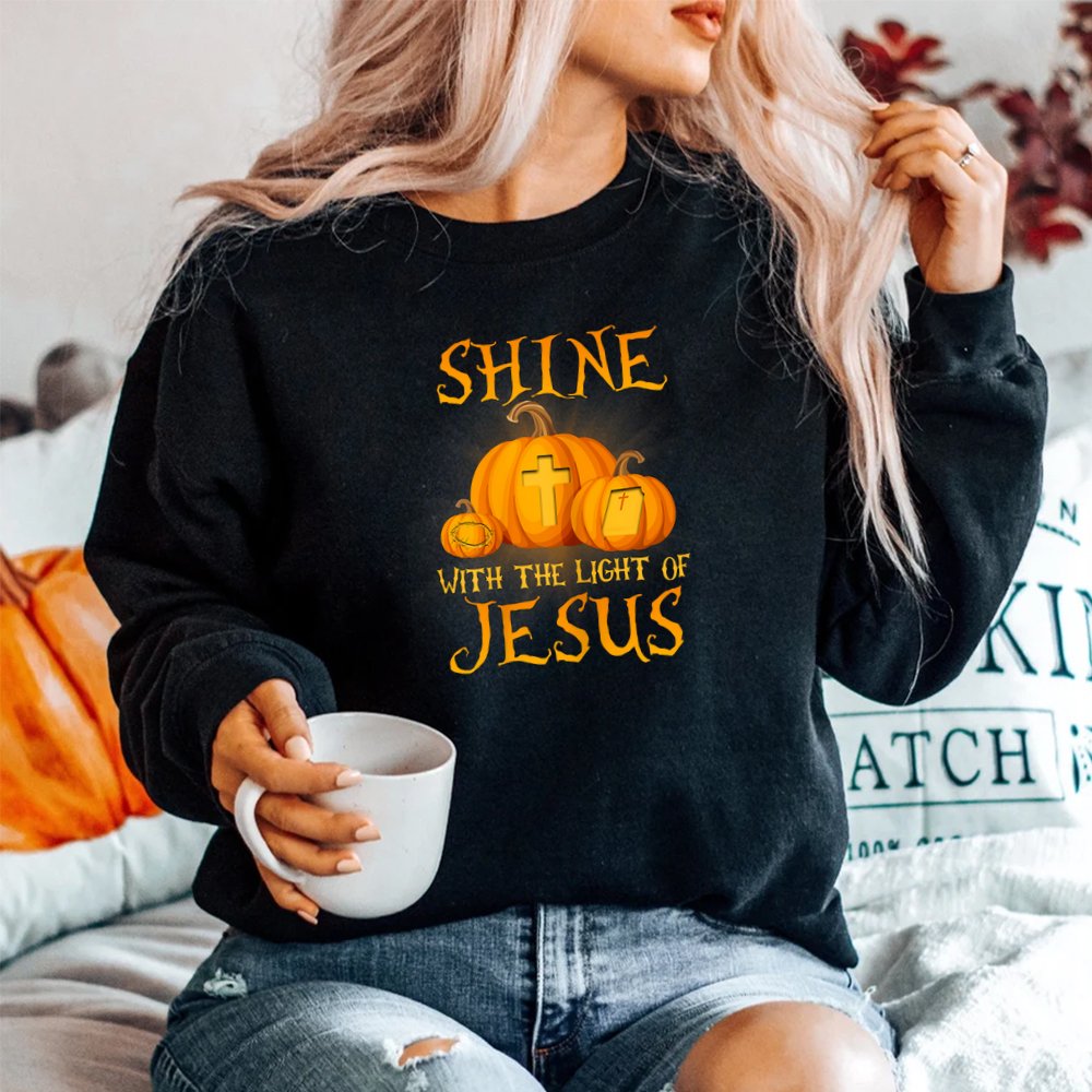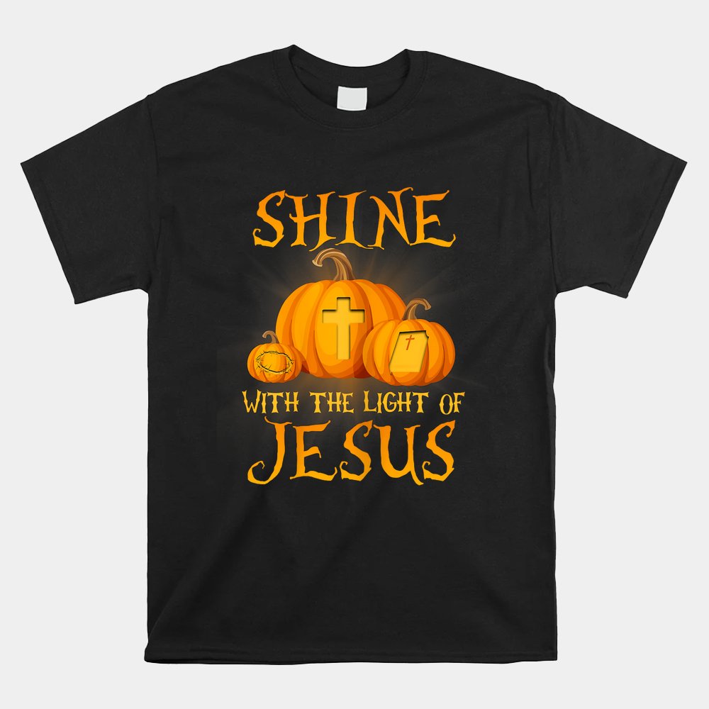 Shine With The Light Of Jesus Christian Halloween Pumpkin Shirt, hoodie, sweatshirt, long sleeve and ladies T-shirt