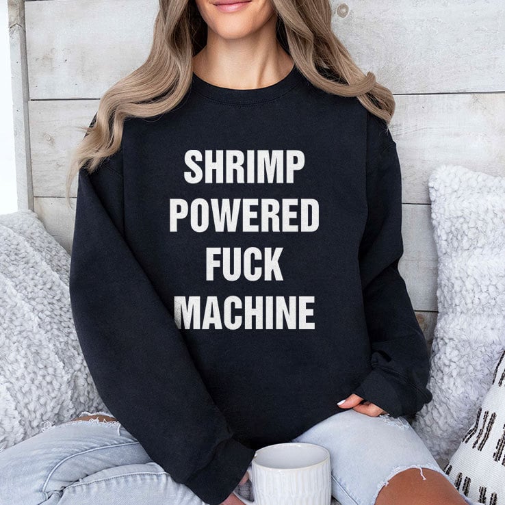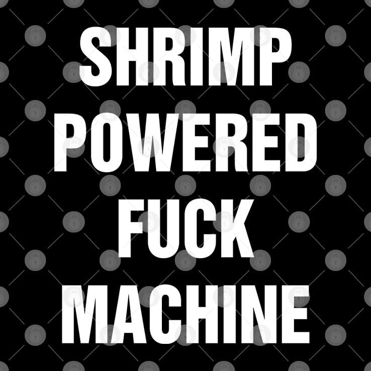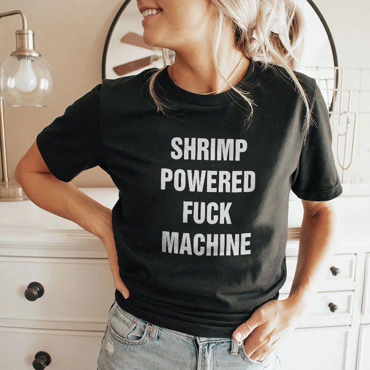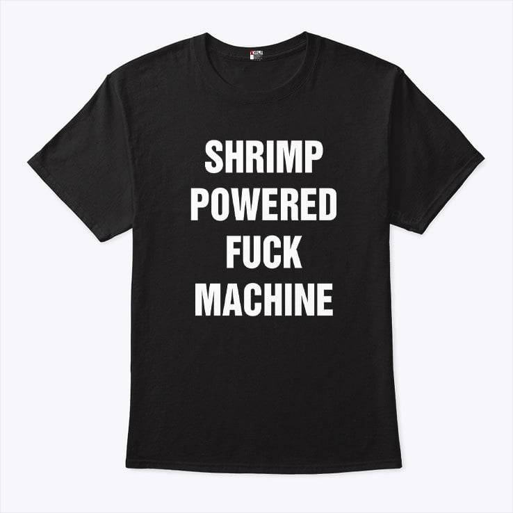 The t-shirt says “shrimp powered fuck machine”. Fuck machine, or sex machine, is a mechanical device designed to simulate human sexual intercourse or other intimate activities.