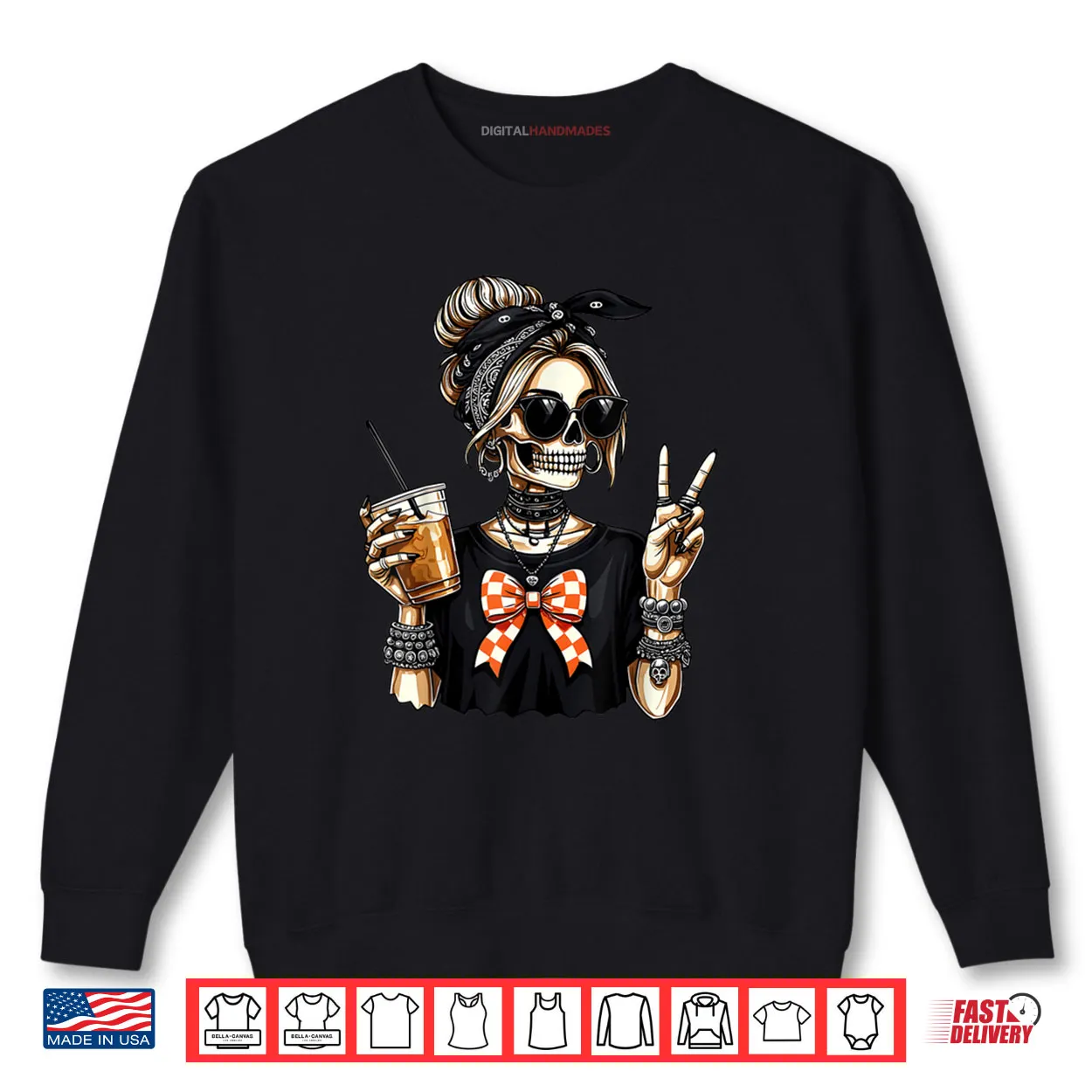 Skeleton Girl Drinking Coffee Peace Sign Graphic Shirt