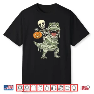 Skeleton Riding Mummy Dinosaur T Rex Halloween Funny Pumpkin Shirt