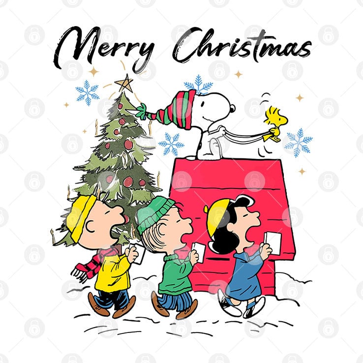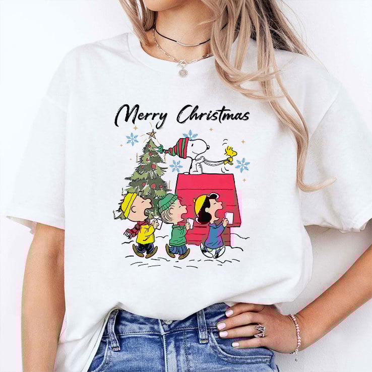 The shirt features beloved characters from the Peanuts comic strip, like Snoopy, Charlie Brown, and other friends, celebrating Christmas. This shirt captures the nostalgic charm of the Peanuts gang during the holiday season, evoking themes of friendship, joy, and the warmth of holiday traditions.