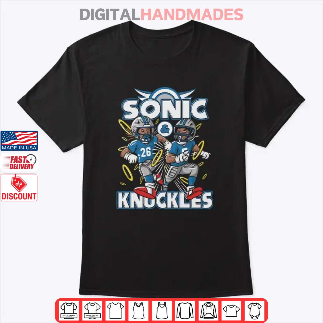 Gear up for game day with a mashup that’s sure to turn heads! This isn’t your average fan gear. We’ve fused the electrifying energy of Sonic and Knuckles with the roaring spirit of the Detroit Lions to create a shirt that’s as unique as you are.