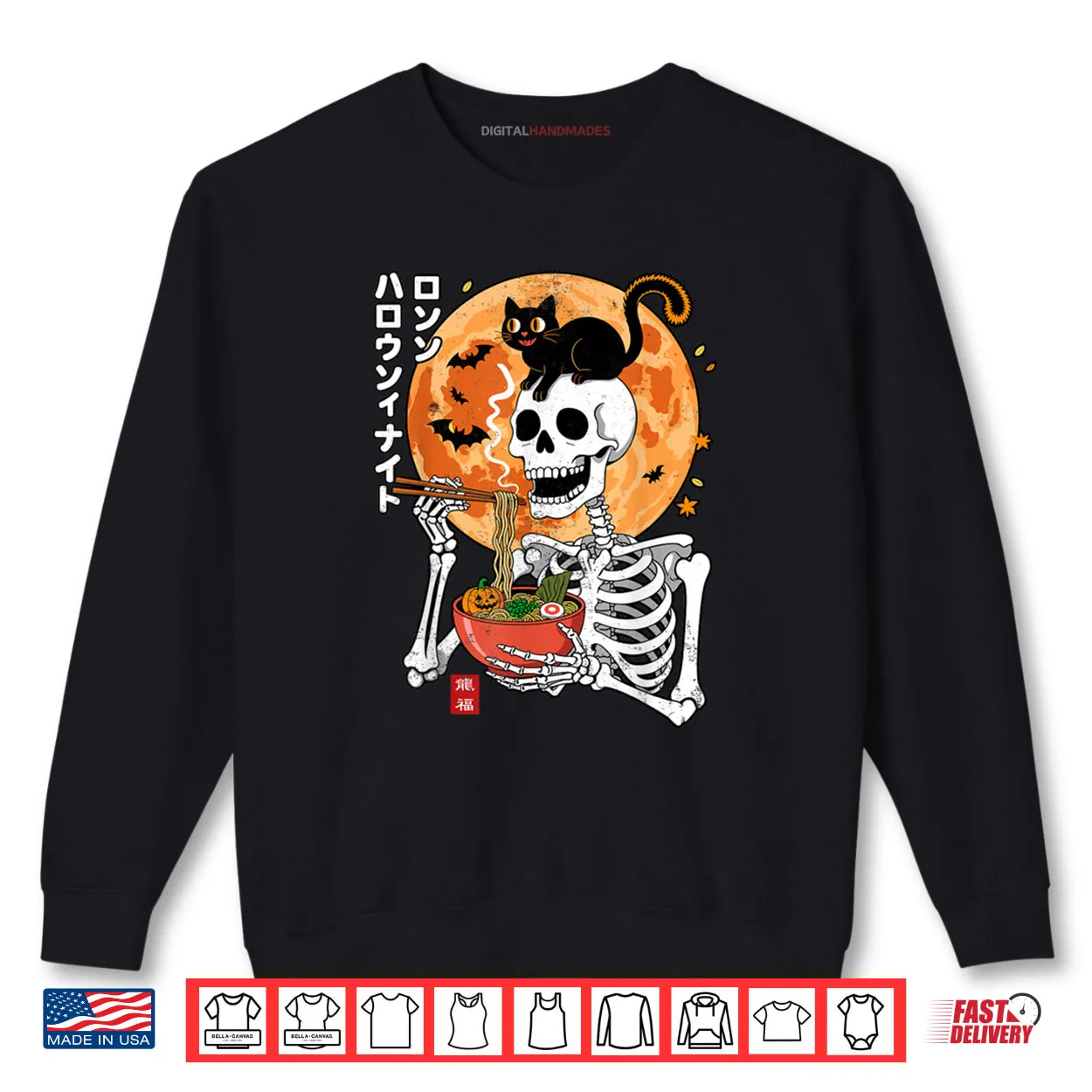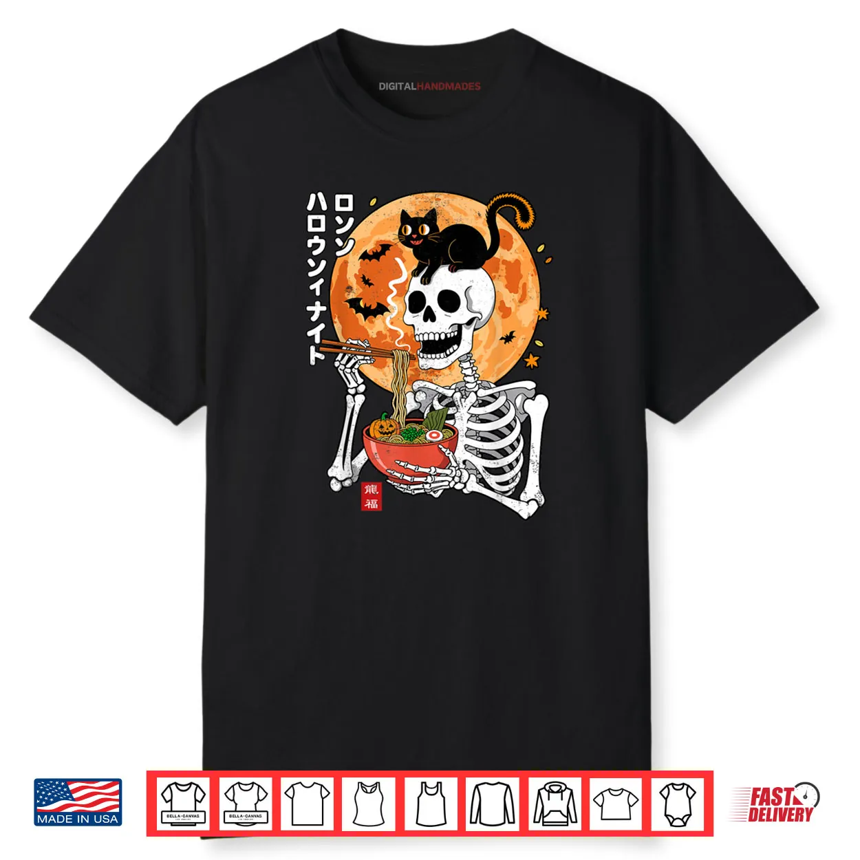 Spooky Skeleton Eating Ramen Bowl with Cat Halloween Shirt