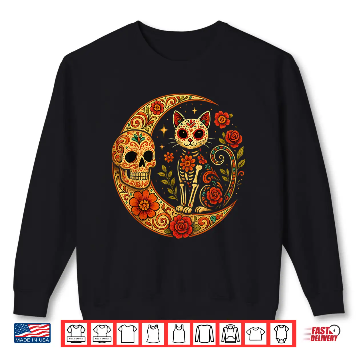Sugar Skull Cat Moon Dia De Los Muertos Funny Halloween Cat Shirt