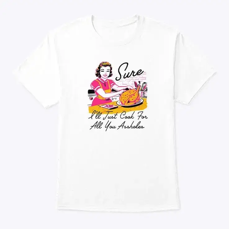 The tone is meant to be exaggerated for comedic effect. It plays on the traditional idea that someone is the “default” cook in a group or family. The Sure I’ll Just Cook For All You Assholes Funny Thanksgiving Shirt is actually just a fun way for a woman who complains about her duty of cooking for others during Thanksgiving Day.