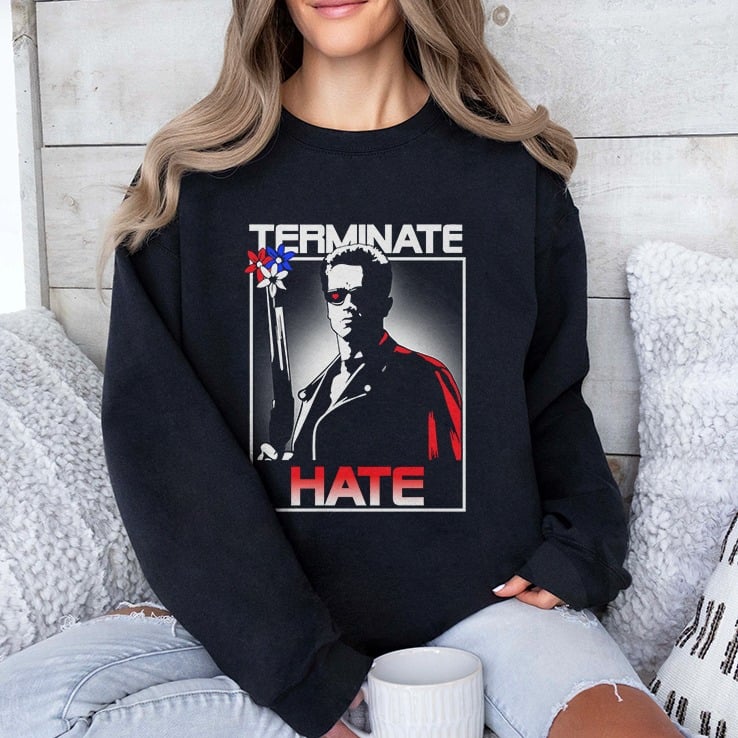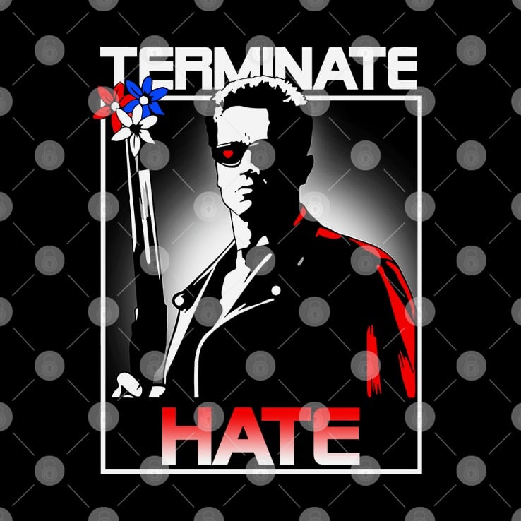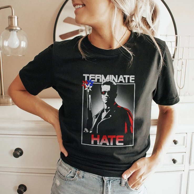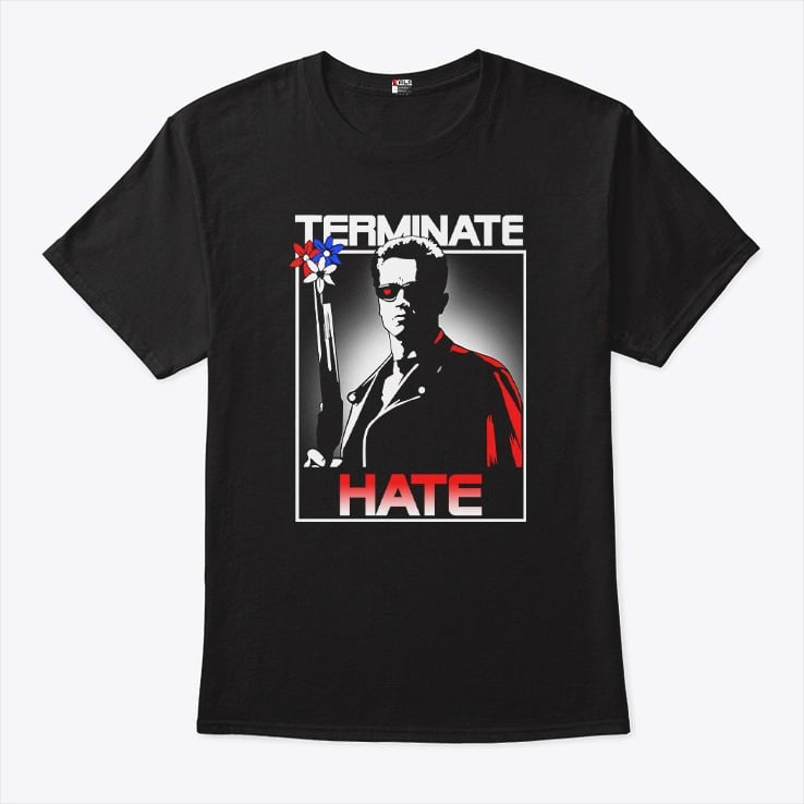 Terminate Hate T Shirt refers to a campaign launched by Arnold Schwarzenegger, who was inspired by far-right hate campaigners in America. Here’s the details:
