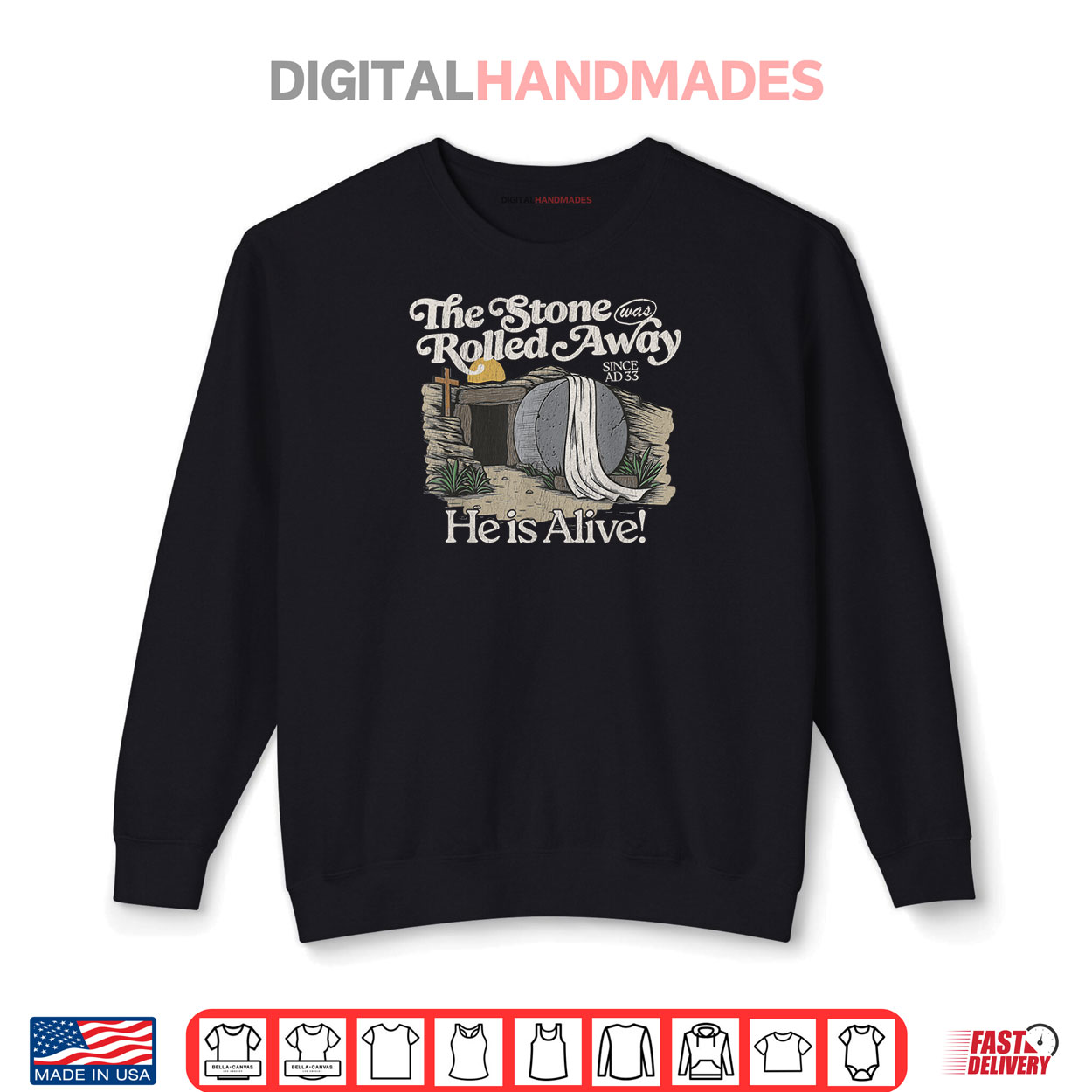 retro stone rolled away alive, christian easter graphic tee, spring faith apparel, funny retro humor shirt, bold alive design, playful casual spring fashion, lighthearted easter tee, springtime vintage style, humorous stone shirt, cute christian apparel