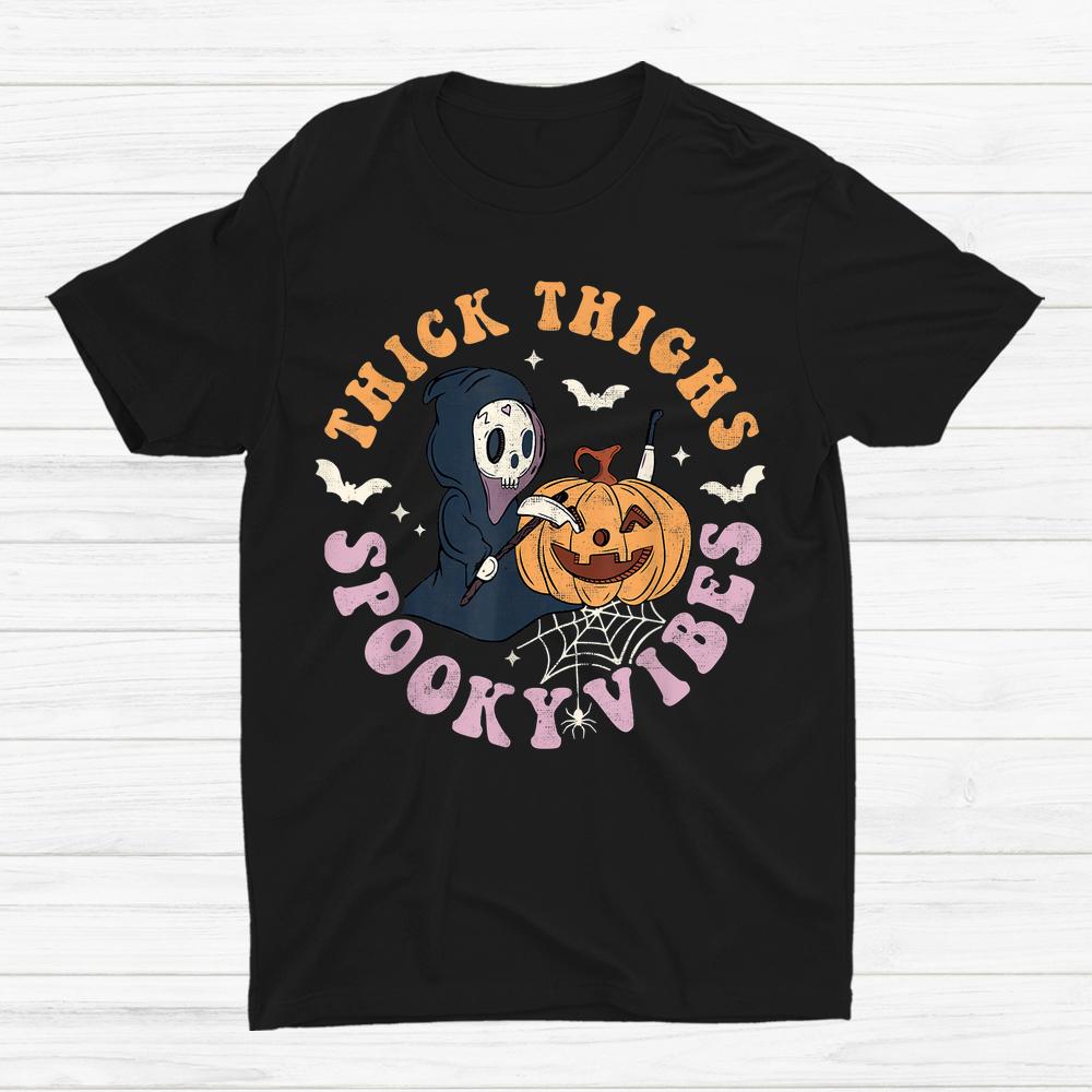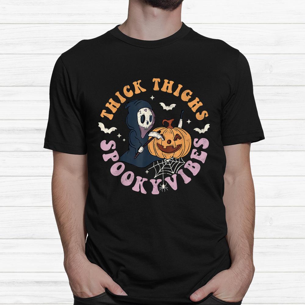 Thick Thighs Spooky Vibes Death Pumpkin Halloween Shirt, hoodie, sweatshirt, long sleeve and ladies T-shirt