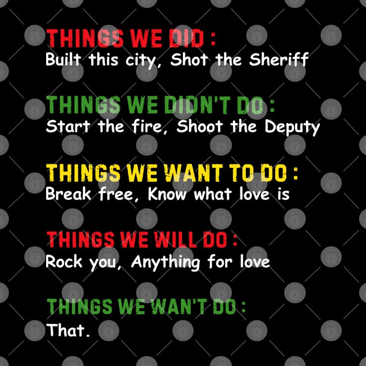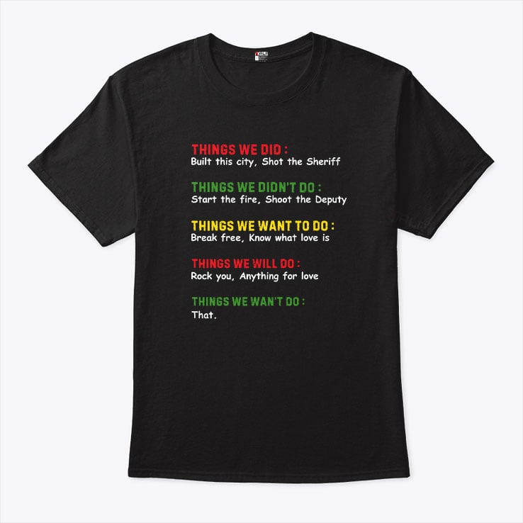 The t-shirt says “Things we did built this city shot the sheriff, things we didn’t do start the fire shoot the deputy, things we want to do break free, know what love is things we will do rock you, anything for love, things we wan’t do that”.
