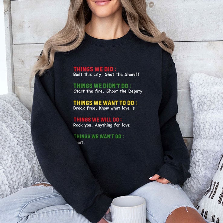 Things We Did Built This City Shot The Sheriff Shirt celebrates themes of rebellion, freedom, love, and strength through references to these classic rock and pop anthems. It’s a bold way to express your love for rock music and its iconic, rebellious spirit.